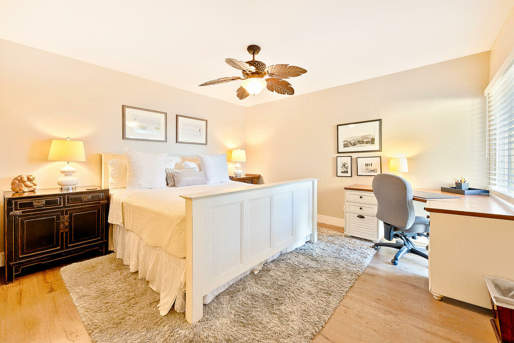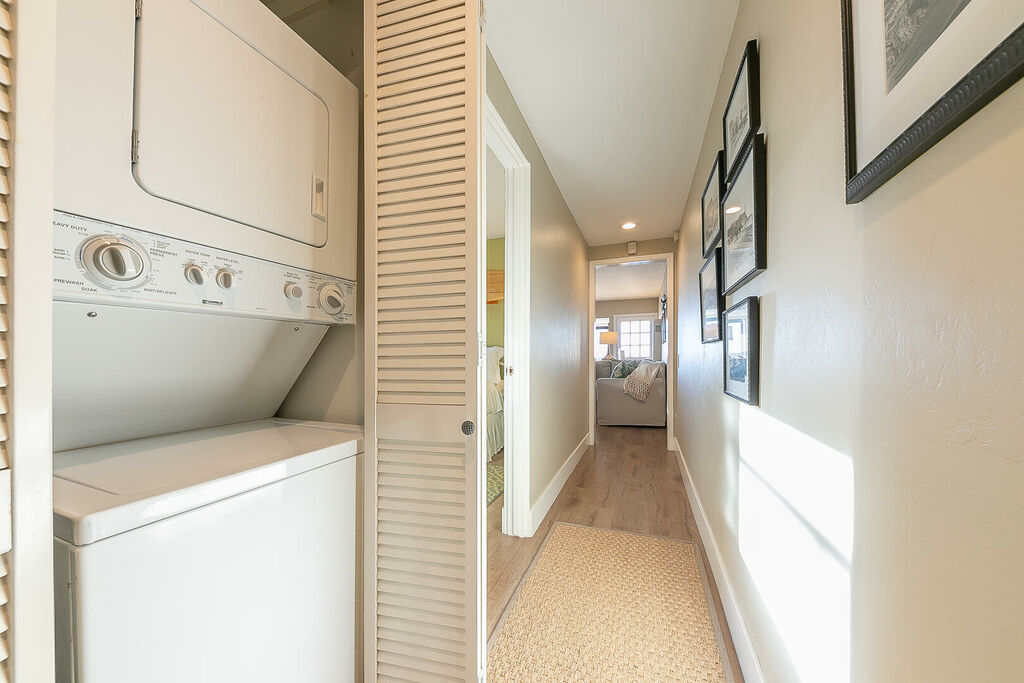 The primary suite is thoughtfully positioned toward the back of the condo and features a king bed, an ensuite bathroom, and a spacious desk—ideal for remote work with the ocean just beyond. The second bedroom, located down the hall, includes a queen bed and a small TV, making it a cozy retreat for guests. A second full bathroom sits conveniently between the bedrooms, and an in-unit washer and dryer in the hallway provide added ease for refreshing beachwear and towels throughout your stay. The home accommodates up to five guests, with sleeping arrangements for four in beds.