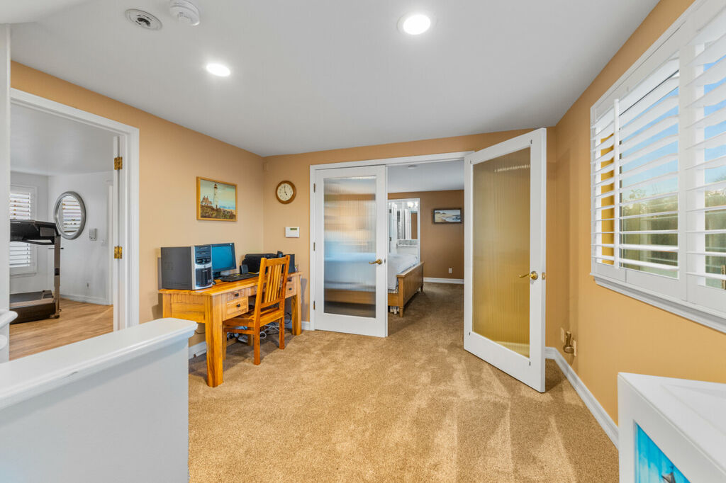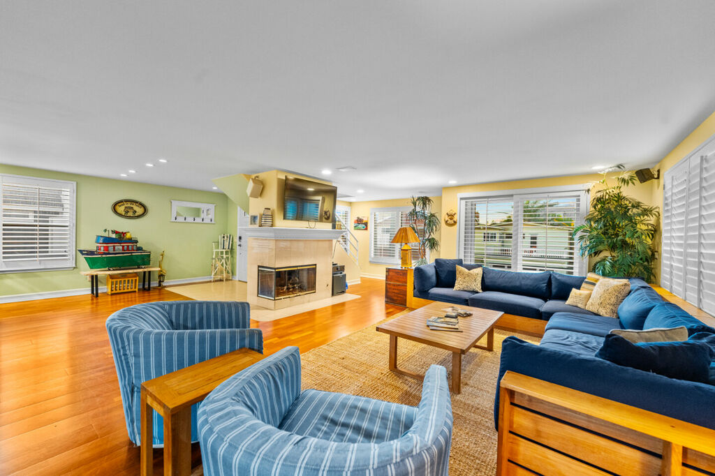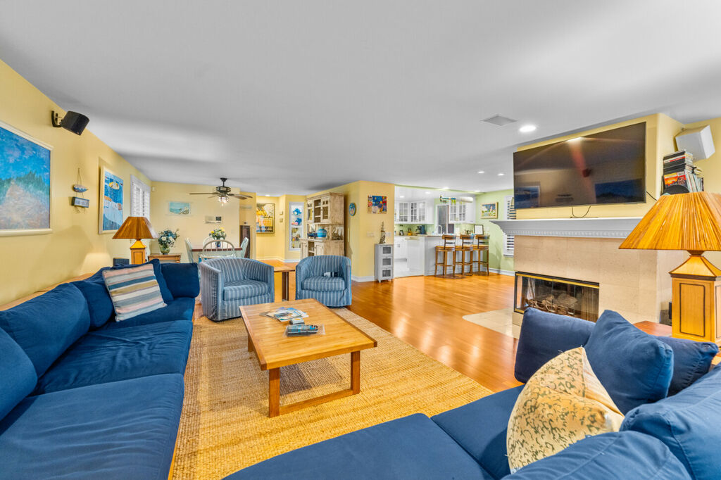 The sunlit living room features glowing wood floors, a gas fireplace, and comfortable seating, creating a welcoming spot to gather. A second living area on the first floor includes a full-size futon and TV, offering a quiet space to unwind. For those who need a moment of focus, the third-floor office area provides a peaceful retreat as well.
