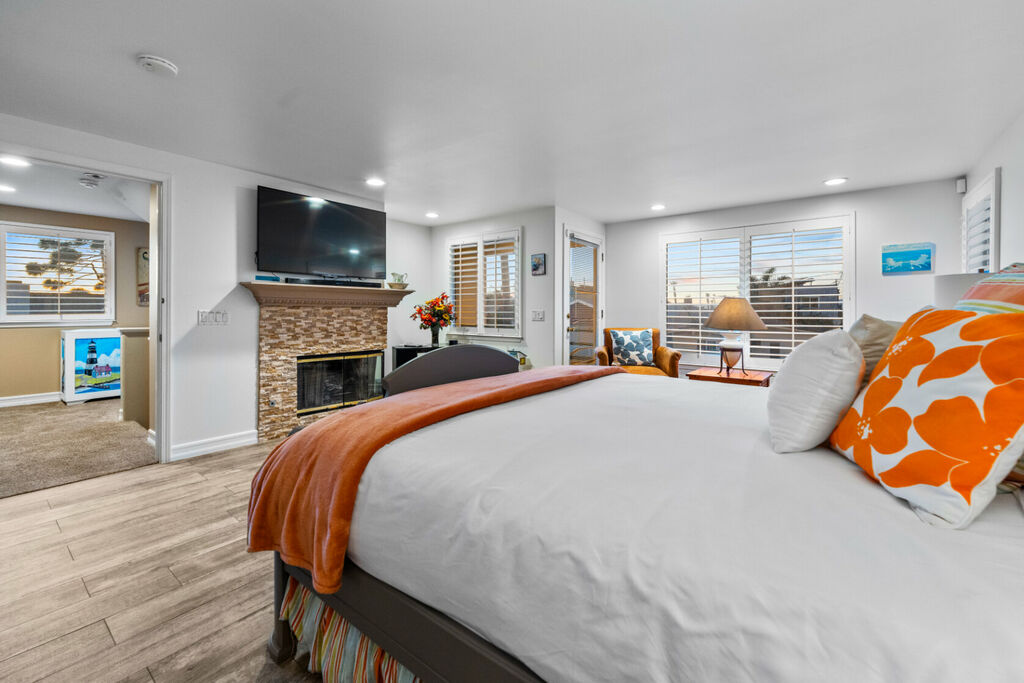 This home sleeps up to eight guests across three spacious suite-style bedrooms and a futon in the den. The third-floor master bedroom is a serene escape with a California king bed, a cozy seating area, a gas fireplace, and direct access to the rooftop deck. Its en-suite bathroom includes a double vanity, a jetted tub, and a walk-in shower.