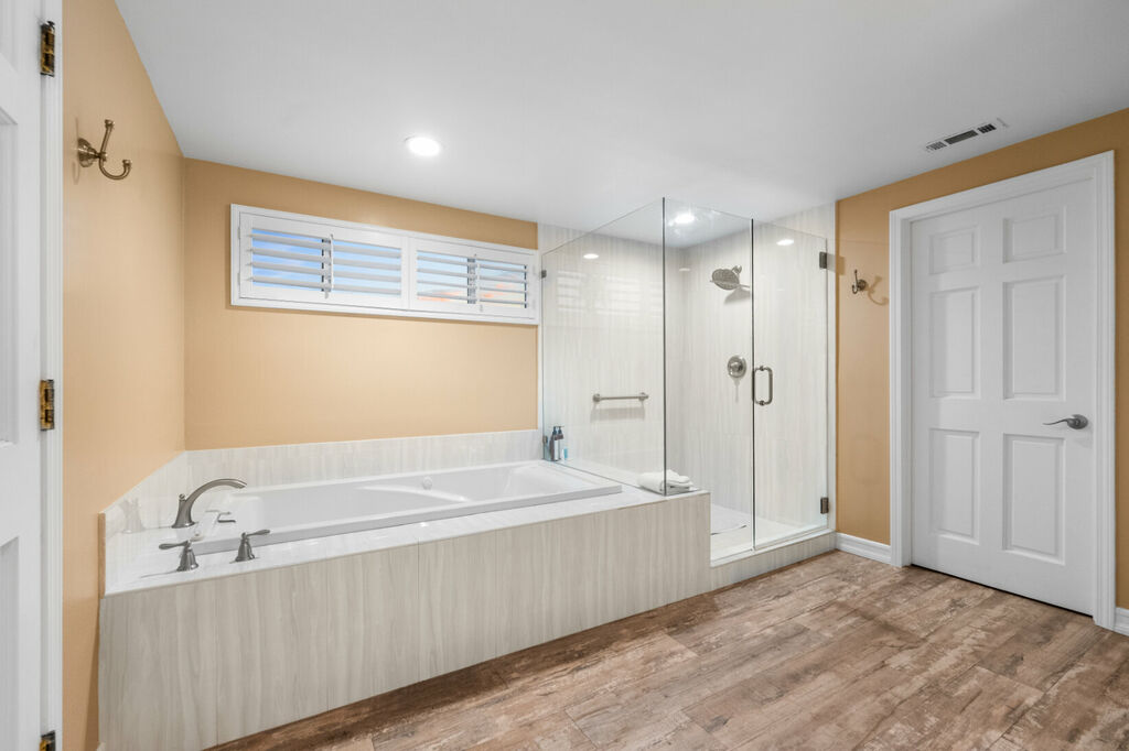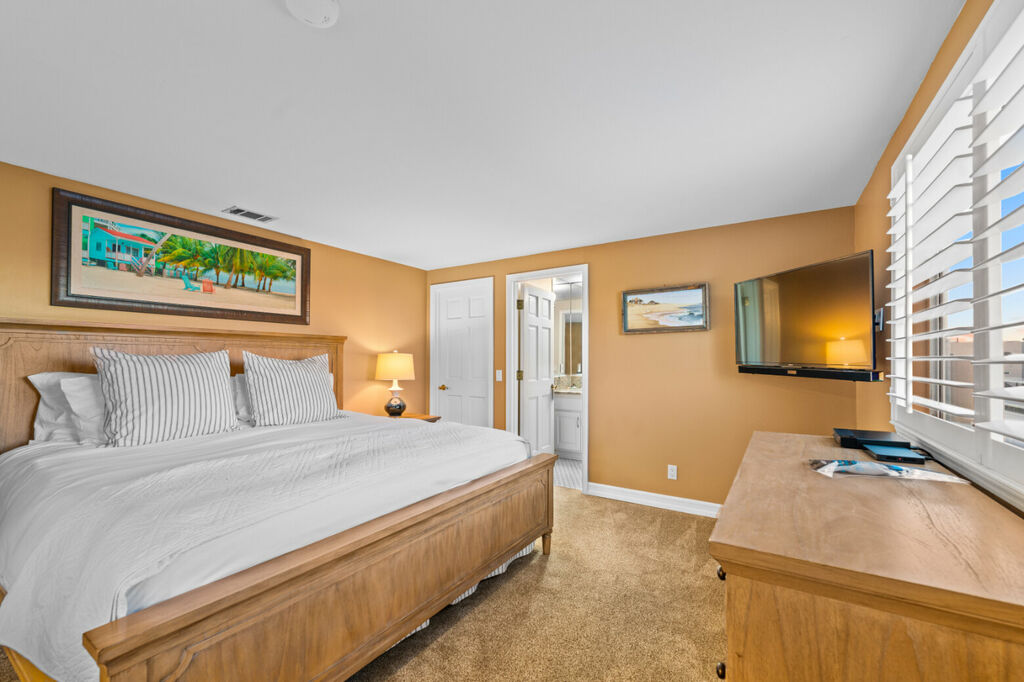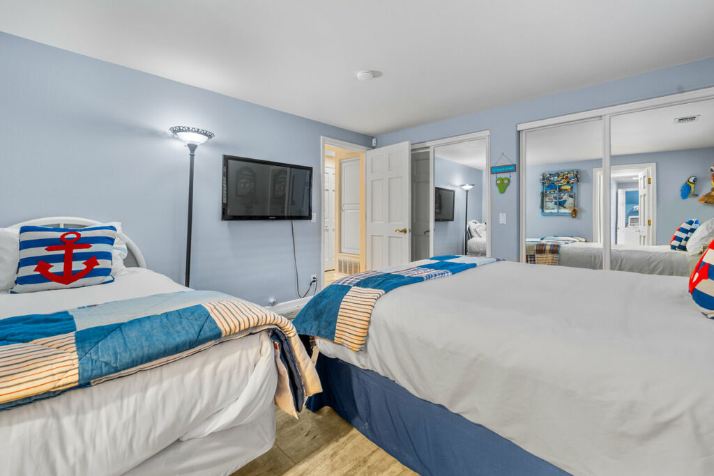 On the first floor, the second bedroom features a queen bed, twin bed, TV, and an en-suite bathroom with a tub/shower combo. The third bedroom, located on the third floor, includes a California king bed, TV, and en-suite bathroom with a tub/shower combo. A convenient half bath is located near the common areas.