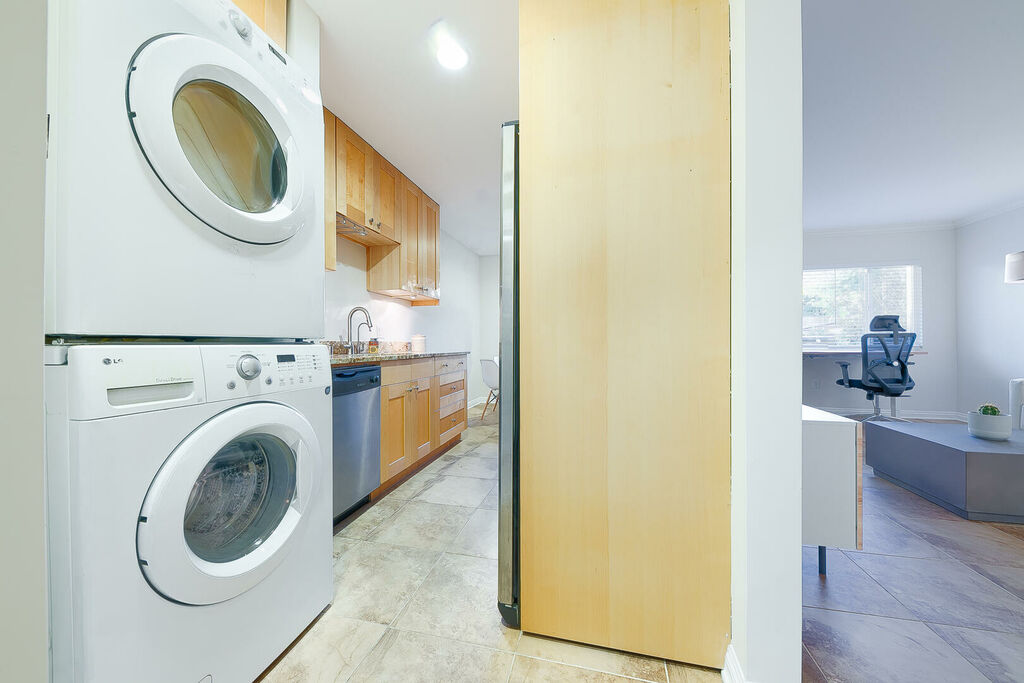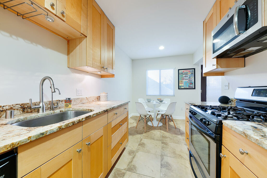 Inside, the bright living room provides a welcoming space to unwind and includes a standing desk for those balancing work and leisure. The sunny dining area flows into a modern kitchen equipped with all the cooking essentials you’ll need for an extended stay. Two private patio areas elevate the experience—grill up dinner on the BBQ, sip cocktails at sunset on the front porch, or simply enjoy the ocean air any time of day. Assigned parking for one vehicle ensures convenience in this highly walkable beach community, and an in-unit washer and dryer add everyday ease.