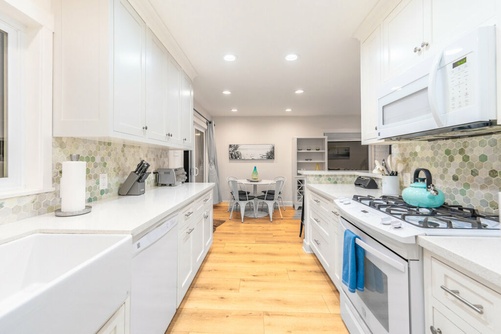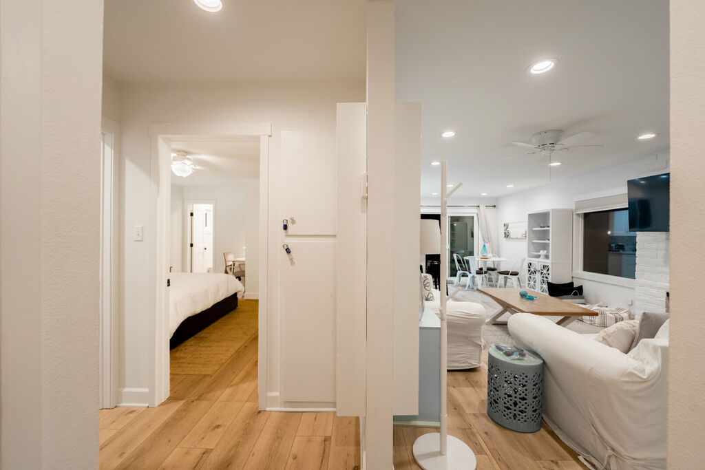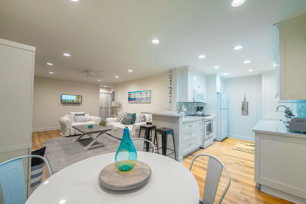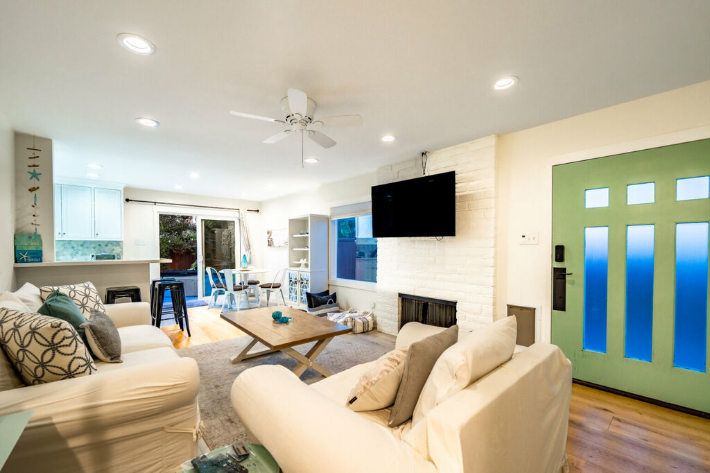 This charming kitchen and living room are both designed to offer all the amenities you need for a relaxing stay. The kitchen offers modern appliances, and is perfect for preparing everything from quick breakfasts to family dinners. The comfortable and spacious living room offers an inviting space to unwind after a long day at the beach, or enjoy a family fun night. Or, if you would prefer to enjoy the outdoors, the back yard features ample seating for dining and leisure, a BBQ grill, and a fire pit perfect for late-night chats under the stars.