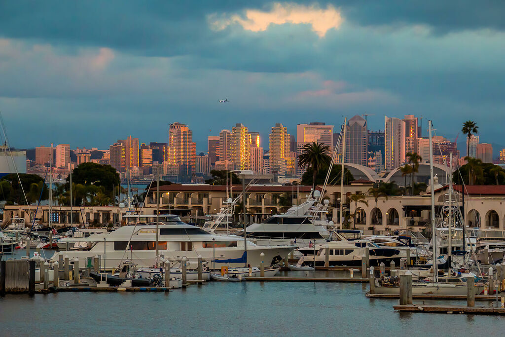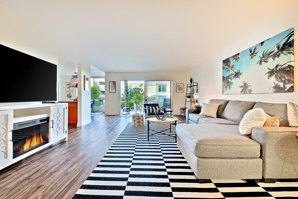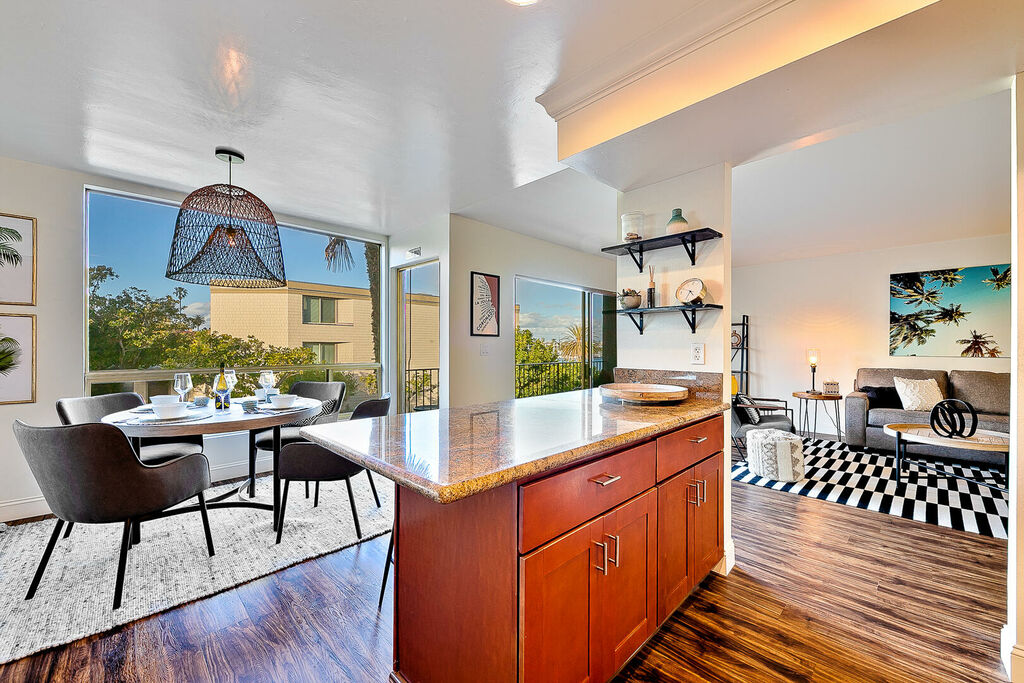 Experience the ultimate in beachside living with this stunning 2-bedroom, 2-bath home just one block from Kellogg Beach, offering spectacular views of Downtown San Diego Bay and the skyline. Inside, the open-concept layout is bathed in natural light from large windows that frame panoramic bay views, while the combination of classic chic and relaxed coastal tones creates a welcoming and stylish atmosphere. The well-equipped kitchen features ample cabinetry and counter space, perfect for preparing meals in your home-away-from-home.