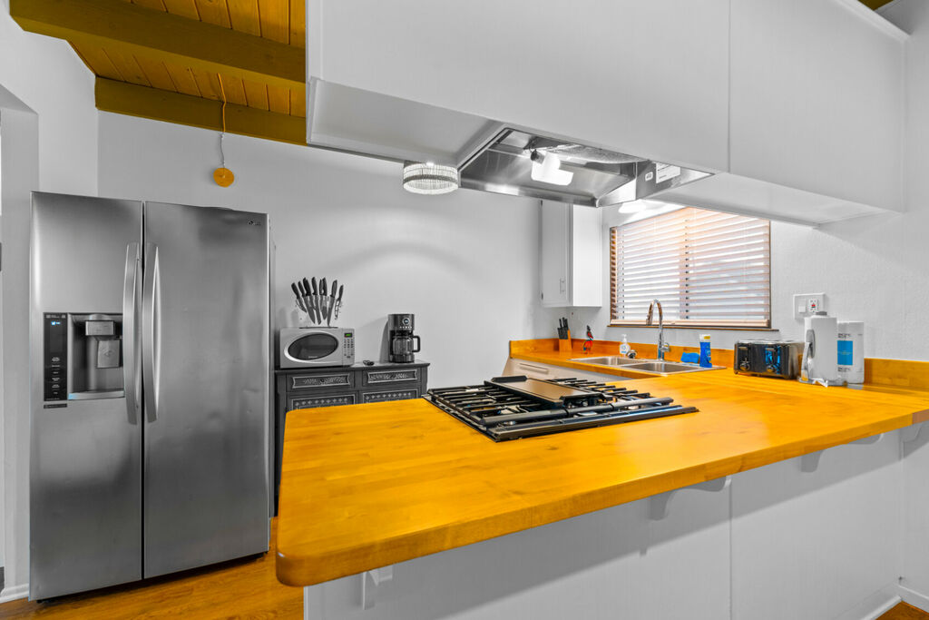 Our newly updated kitchen is equipped with essential cooking amenities. The full-size LG fridge includes a filtered water dispenser and ice maker, while the brand new Samsung stove is perfect for preparing delicious meals after a day at the beach.