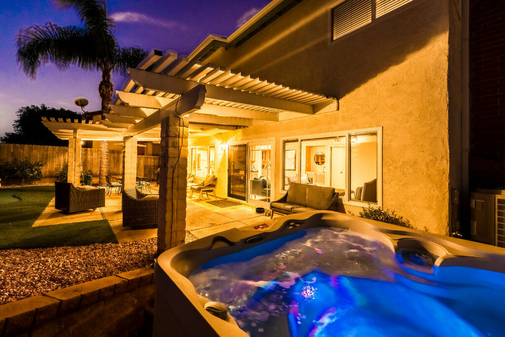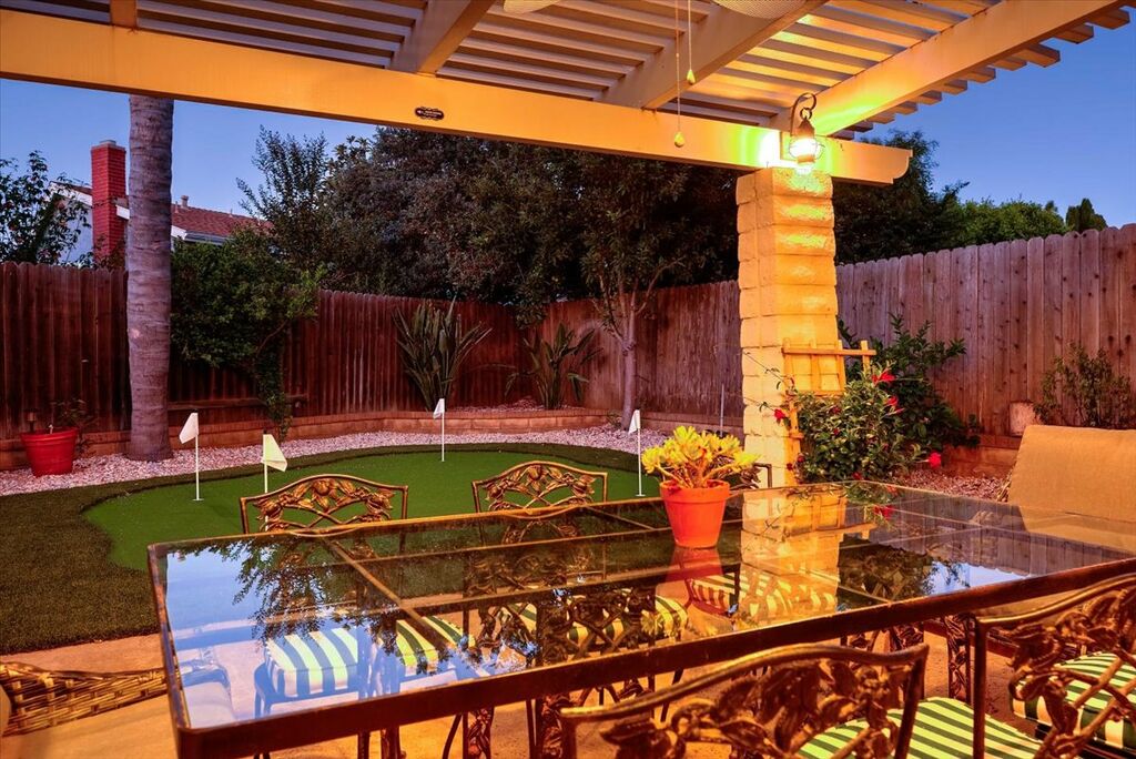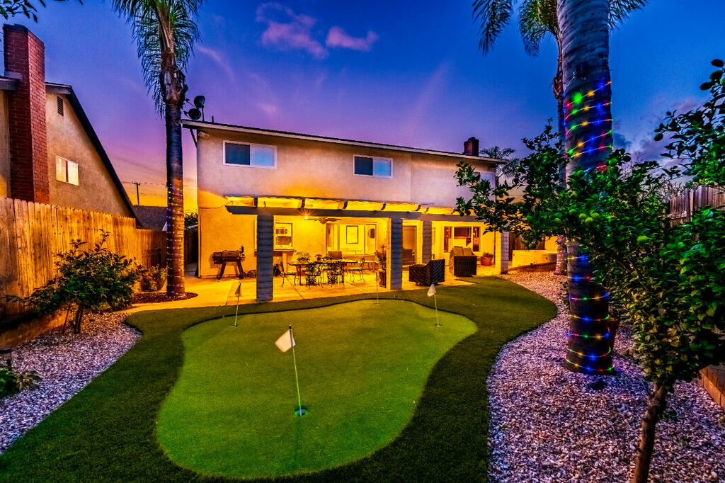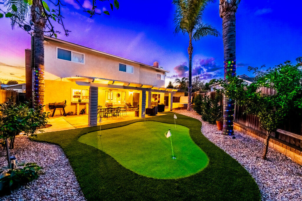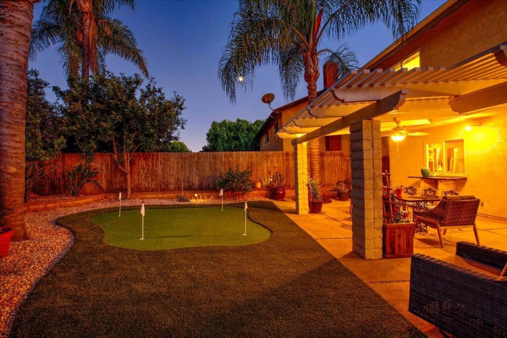 The backyard is a hub of leisure and fun, featuring a putting green and a pool with ambient lighting. An above-ground spa offers relaxation with heated jets, perfect for unwinding under the stars.