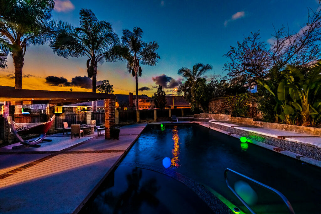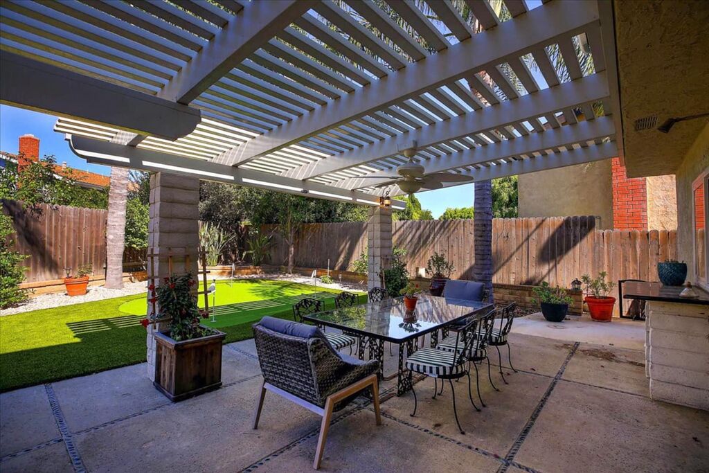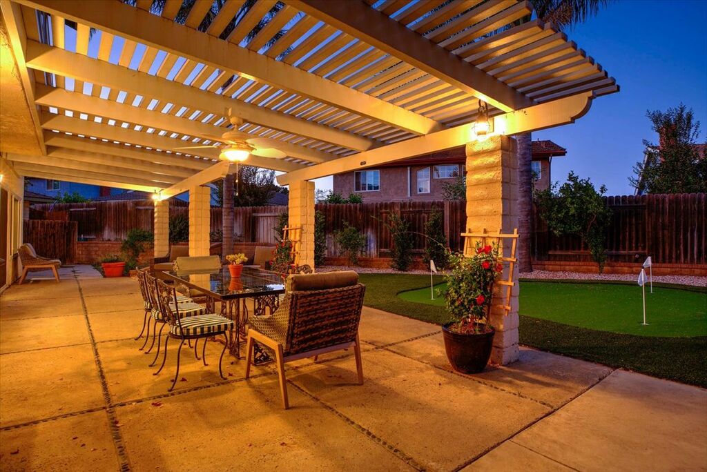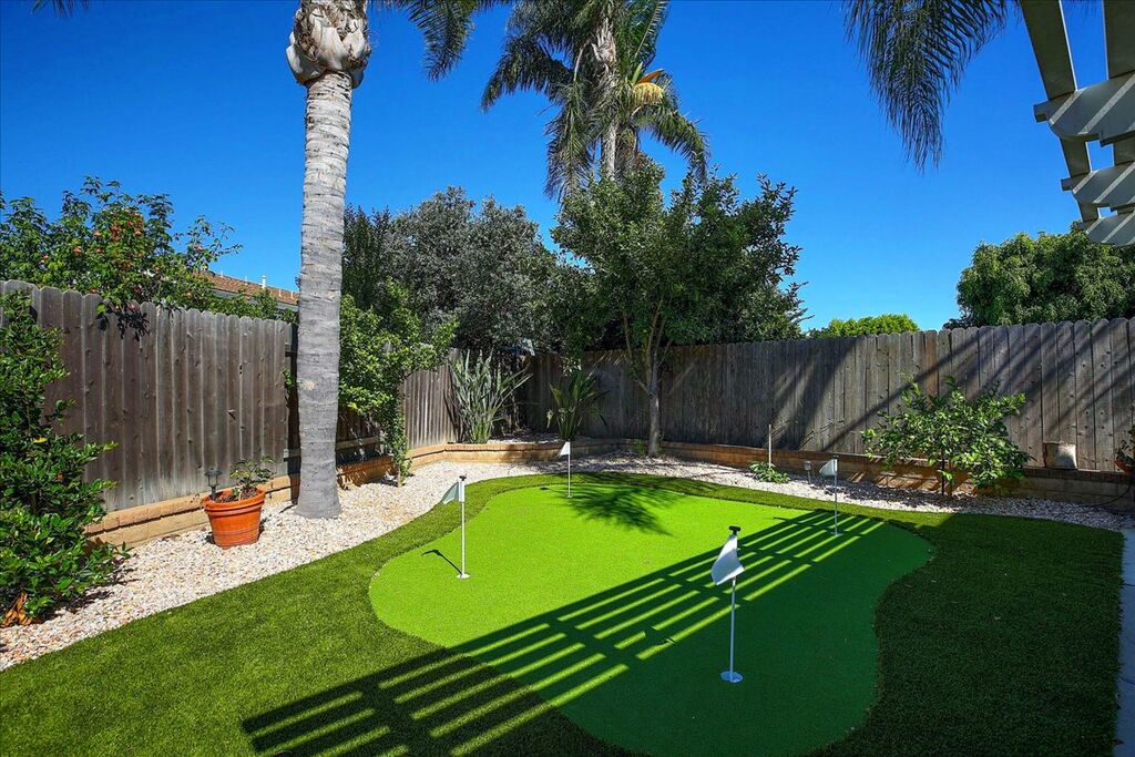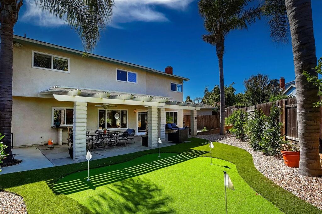 The backyard is a hub of leisure and fun, featuring a putting green and a pool with ambient lighting. An above-ground spa offers relaxation with heated jets, perfect for unwinding under the stars.