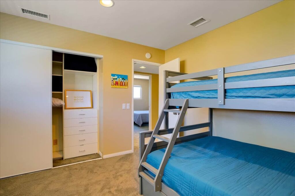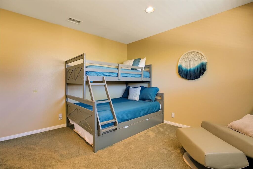 Upon entering, an open floor plan connects the living, dining, and kitchen areas. Four sizable bedrooms offer comfort, with the master suite providing a king sized bed and an ensuite bathroom. Two other guest rooms provide queen sized beds, with the final guest room offering a twin over full bunk bed with a twin sized trundle.