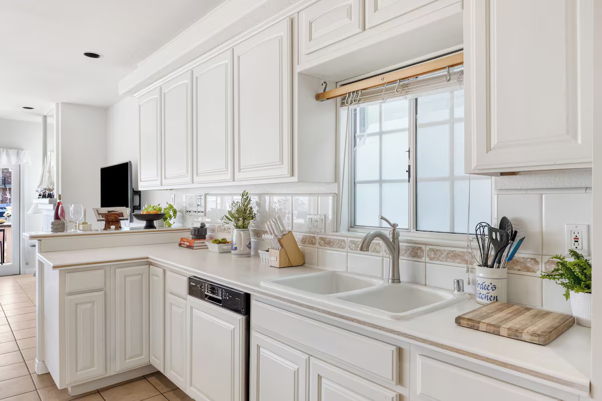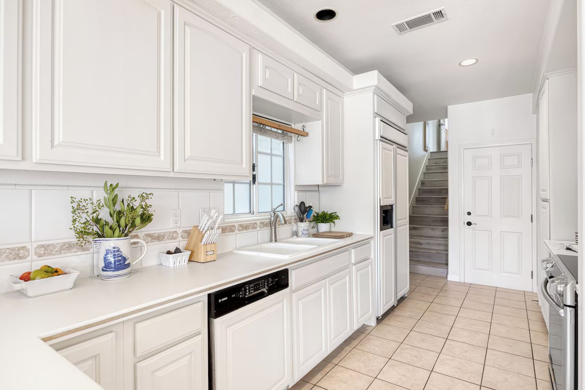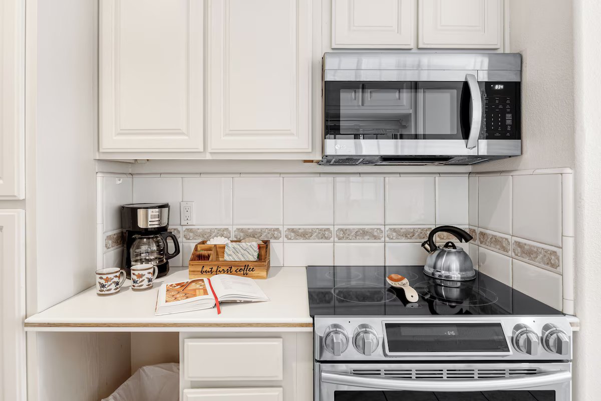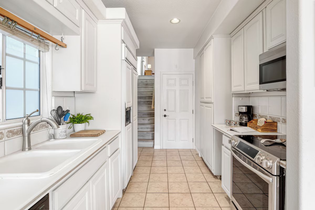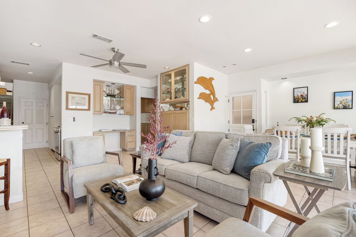 Inside, the home features a bright, welcoming interior with a refined yet comfortable feel. The living room offers plush seating, a TV for relaxed evenings, and a full sized sleeper-sofa for additional sleeping flexibility. The fully equipped kitchen includes a full suite of appliances, dining for six, and casual counter seating, making it easy to enjoy everything from quick breakfasts to leisurely dinners.