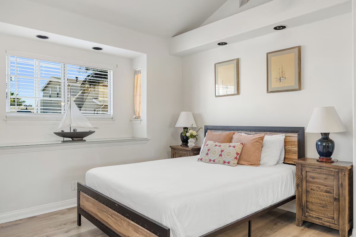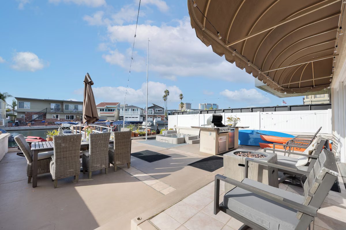 The canal-side patio is the heart of the home, designed for enjoying life outdoors. Unwind in the private hot tub overlooking the water, stretch out on sun loungers, or gather for open-air meals at the dining area with a grill and prep space. The shared dock delivers an authentic waterfront experience, and even offers a Duffy boat available for rent, so you can cruise the canals and soak in Newport’s coastal charm.