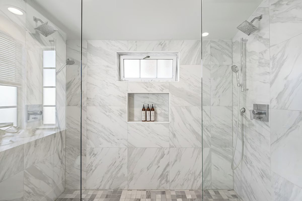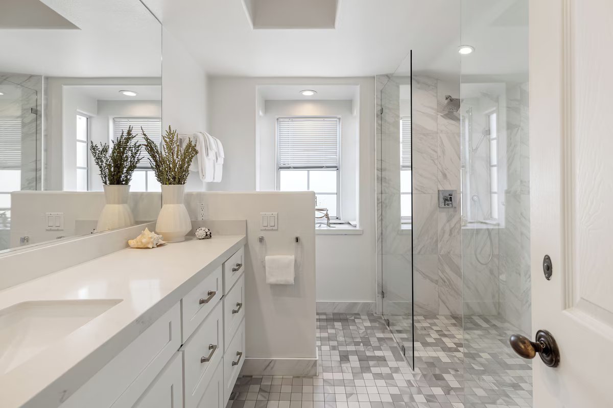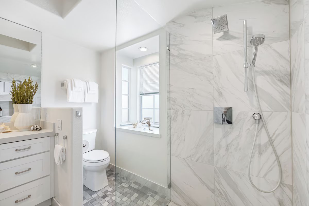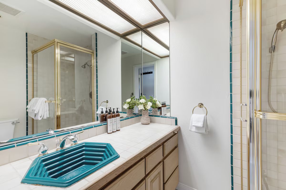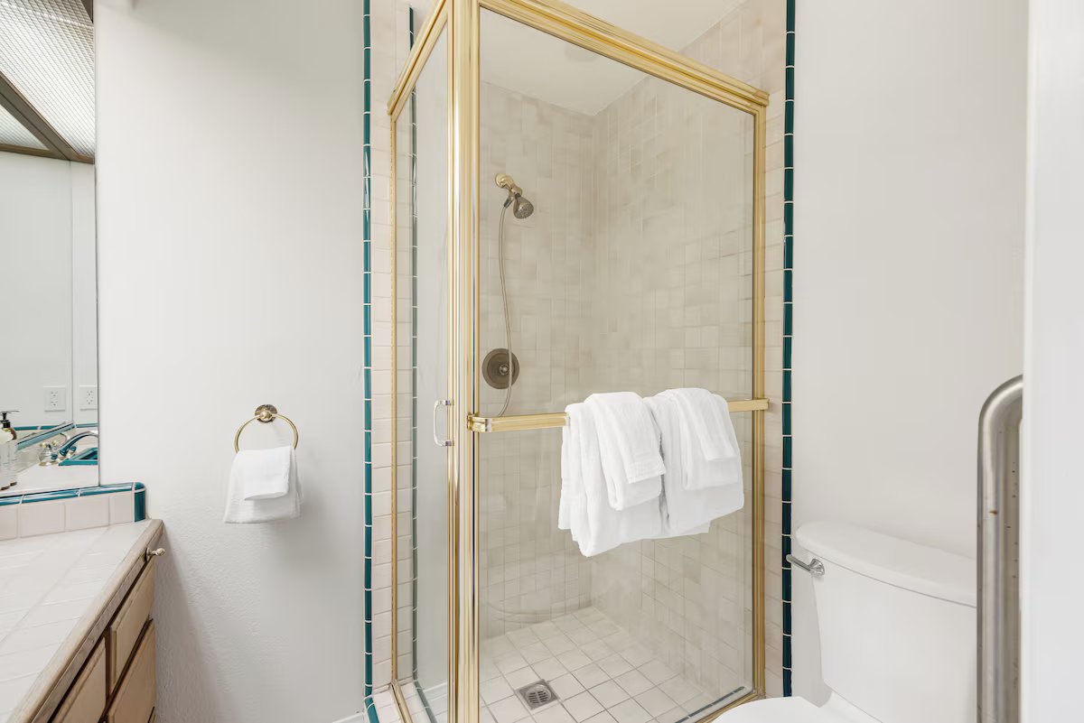 The master suite includes a queen bed, an additional twin bed, and an ensuite bathroom with a spacious dual-showerhead shower. The second bedroom features a queen bed and its own TV. An additional full bathroom and a powder room ensure plenty of space to refresh and unwind.