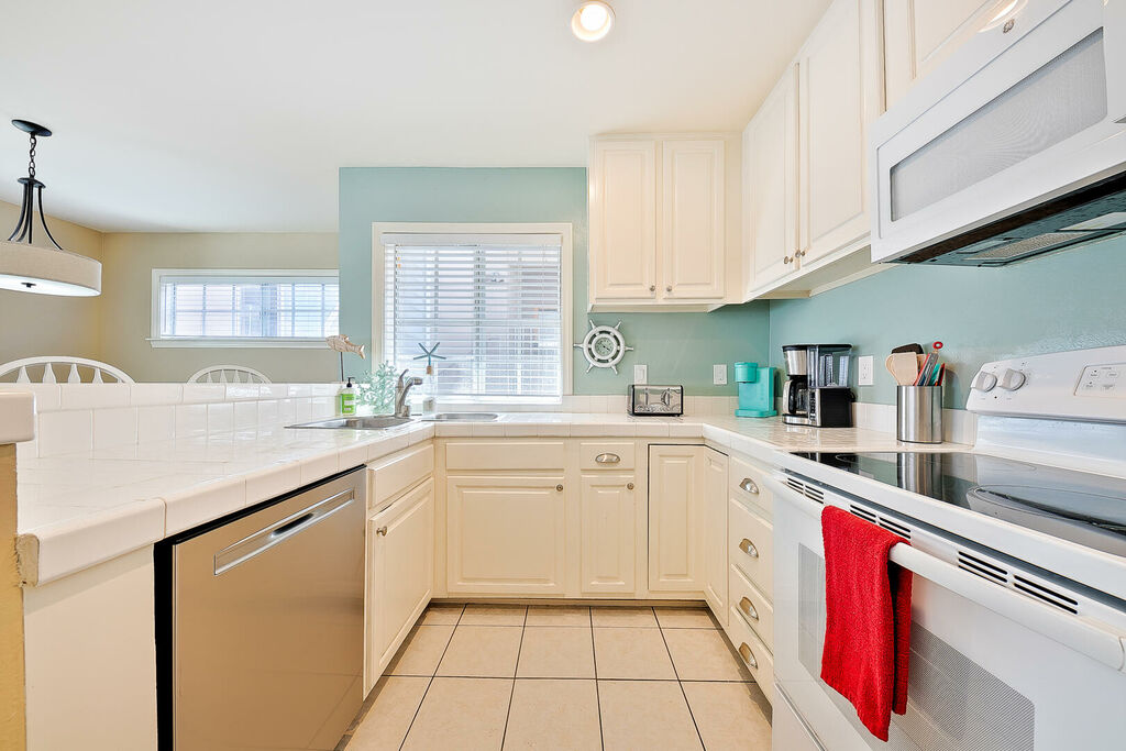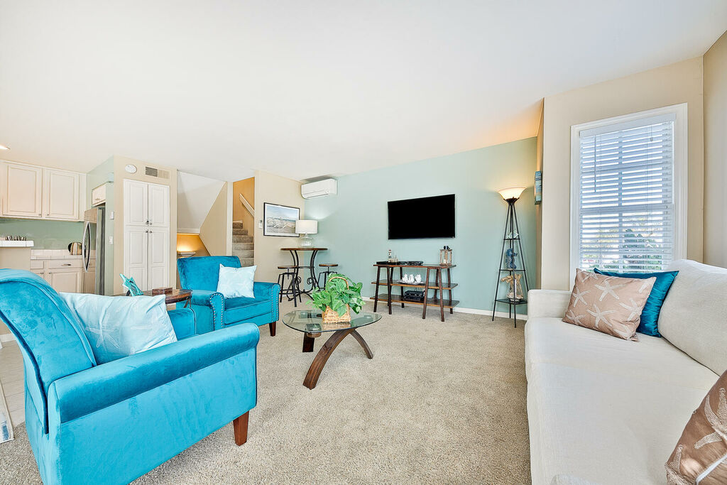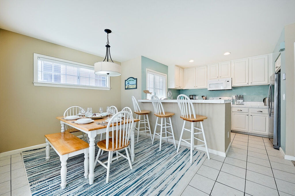 The second floor serves as the main living and entertaining space, featuring a fully equipped kitchen with an electric stove, oven, microwave, dishwasher, and three counter seats. The dining area accommodates four at the table plus a bench, with additional seating at a cocktail table in the living room. The living room also offers a large flat-screen TV, a three-person couch, and a chair with ottoman. Step onto the small balcony for peek ocean views, or descend to the ground-floor patio for outdoor dining and relaxing.