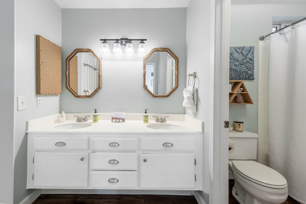 As you step inside, you'll be greeted by a cozy living space adorned with coastal decor, inviting you to unwind after a day in the sand. Sink into the sectional sofa and enjoy as you catch up on your favorite shows on the flat-screen TV.