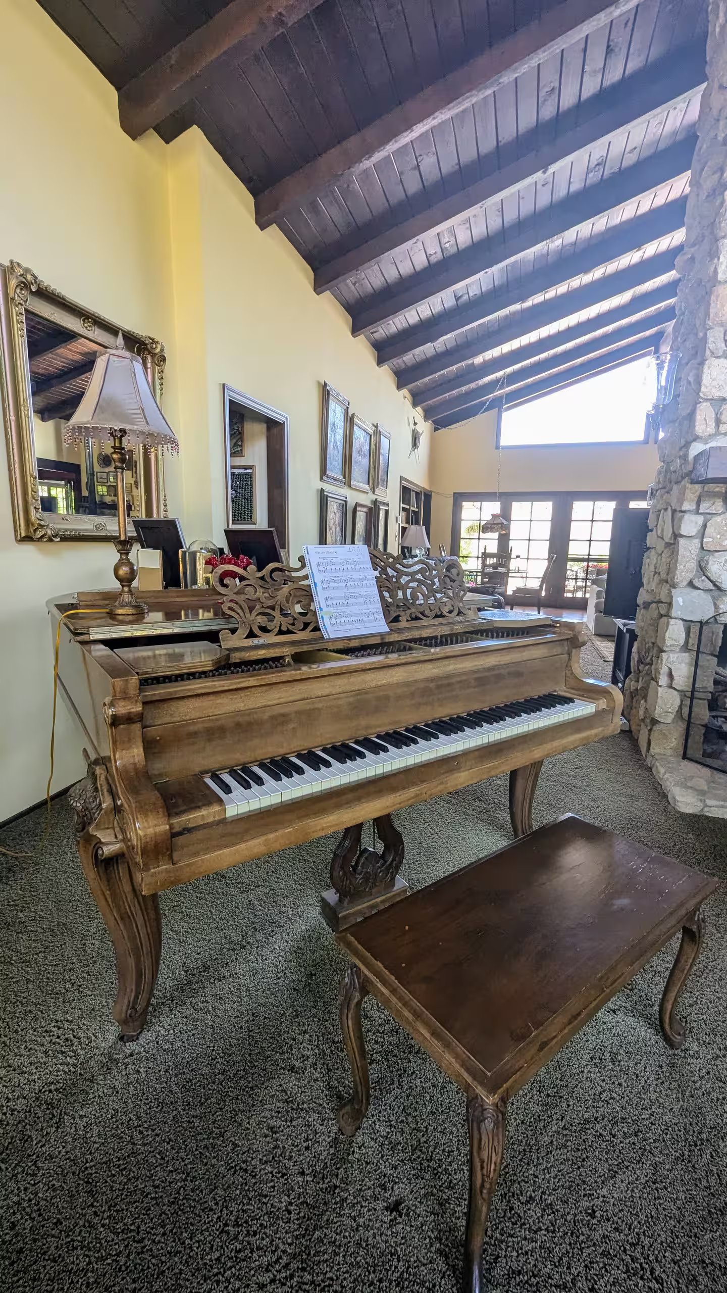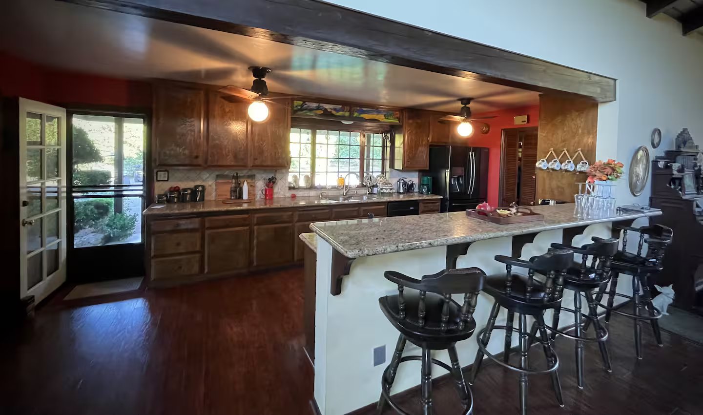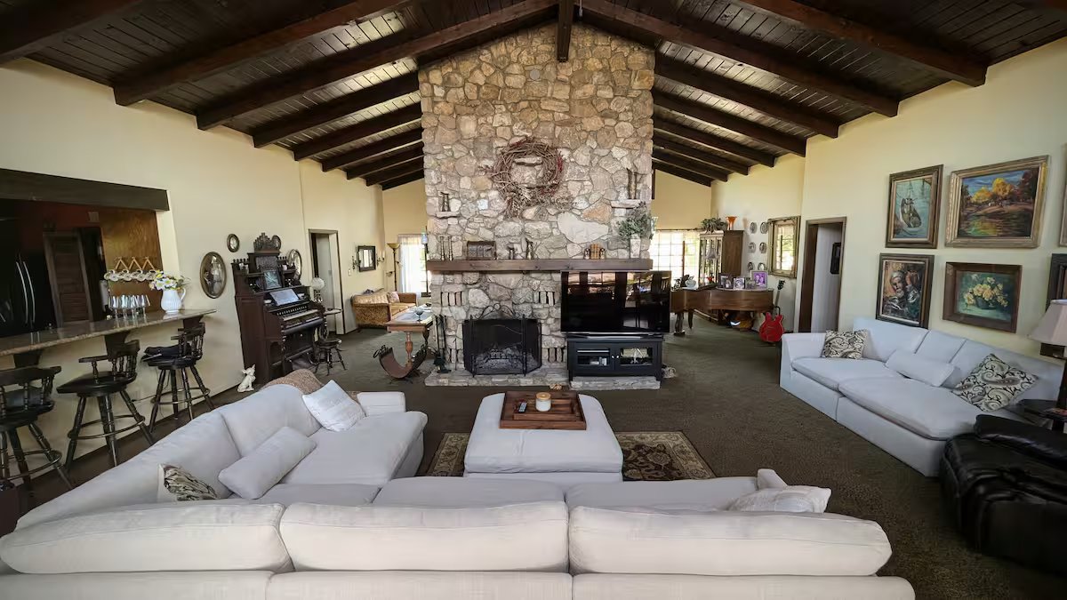 Inside, the home blends ranch character with spacious gathering areas designed for connection. The grand living room features soaring ceilings, large sectional seating, and a dramatic rock fireplace that creates a warm and welcoming centerpiece. A vintage baby grand piano adds to the home’s timeless charm, making the space perfect for music, conversation, or cozy evenings together. The large dining room and kitchen are equally suited for entertaining, with plenty of room for group meals and barstool seating for casual breakfasts or grand dinners.