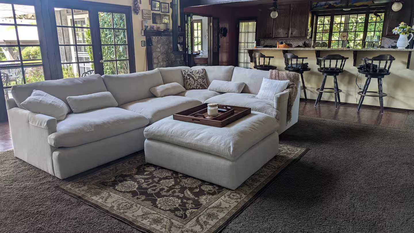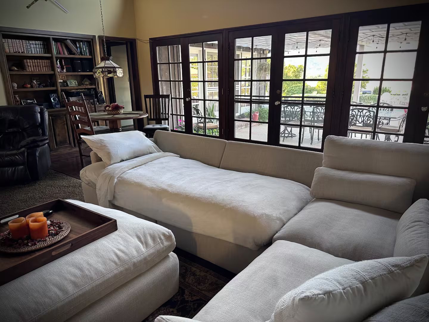 The home comfortably sleeps up to eight guests across three bedrooms. The primary suite includes a king bed and a pullout sofa, offering plenty of space to unwind. Two additional bedrooms each feature queen beds, while the generous sectional seating areas can also accommodate additional sleepers if needed. With multiple living areas and ample space both indoors and out, the home is well suited for families and groups looking to spend meaningful time together.