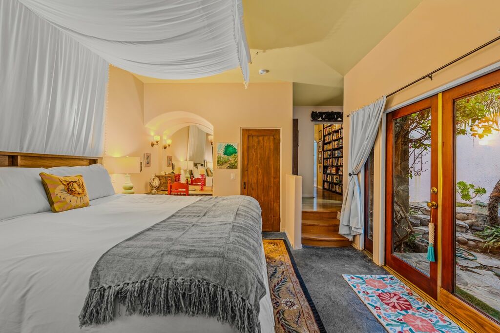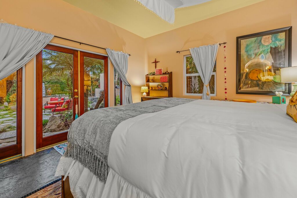 Step outside and enjoy one of the home’s most loved features—the lush backyard. Framed by mature palms and native California plants, the outdoor space feels peaceful and private. Guests love soaking in the hot tub, relaxing under the trees, and gathering around the rustic elements, including an old stone well and a decorative outdoor fireplace that add nostalgic character to the space.