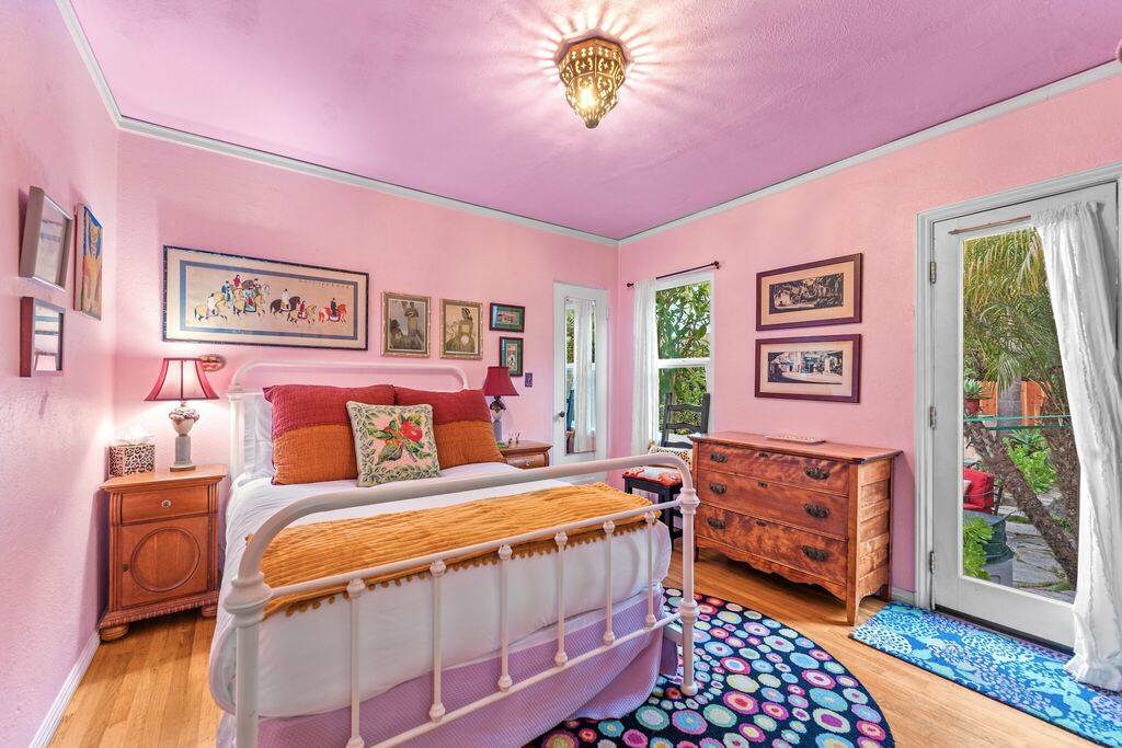 Inside, the home embraces its colonial-style roots. Each room has its own personality, featuring bold colors, art-filled walls, and decor collected over time. The furnishings are cozy and functional, while the bedrooms offer soft linens and simple, comfortable sleeping spaces.