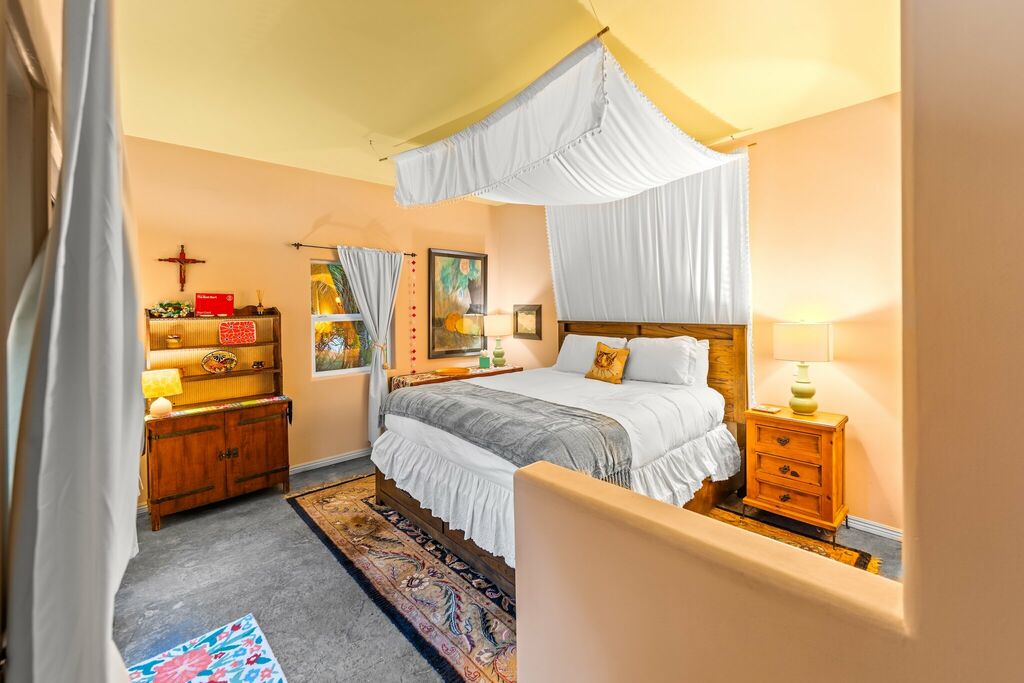 Inside, each room has its own personality, filled with bold colors, art-covered walls, and decor thoughtfully collected over time. The bedrooms are cozy and familiar, with soft linens and homey touches that make you instantly comfortable. The bathroom offers shower/tub combo.