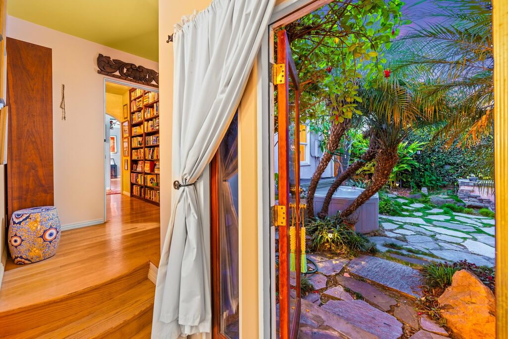 Step outside and unwind in the backyard, where you can enjoy a soak in your private hot tub. Surrounded by mature palm trees and native California plants, the space is full of charm. An old stone well and a decor-only outdoor fireplace add rustic character and become natural gathering spots for you and your friends/family.