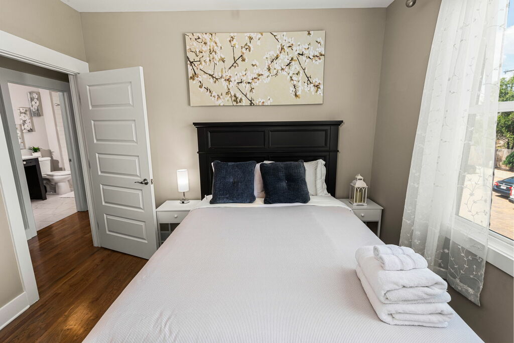 The master bedroom offers a cozy escape featuring a comfortable Queen bed and en-suite bathroom. The second bedroom provides a serene atmosphere with a cozy Queen bed. Ample natural lighting fills the rooms, creating a bright and inviting space for rest and relaxation.