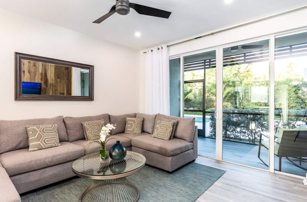 Upon entering the townhome, you'll be greeted by a spacious, open-concept living area featuring contemporary furnishings and abundant natural light. The living room is tastefully decorated, providing a cozy space for relaxation, while large glass doors lead to a private screened in patio where you can take in the tropical breeze.