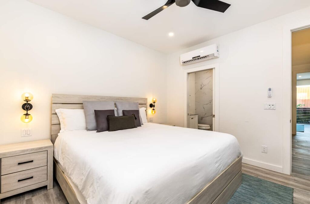 Upstairs, you'll find two well-appointed bedrooms, each with its own en-suite bathroom. The master bedroom features a comfortable king-sized bed and a private balcony, offering a tranquil spot to start your day or unwind in the evening. The guest bedroom is equally inviting, with comfortable accommodations for additional guests.