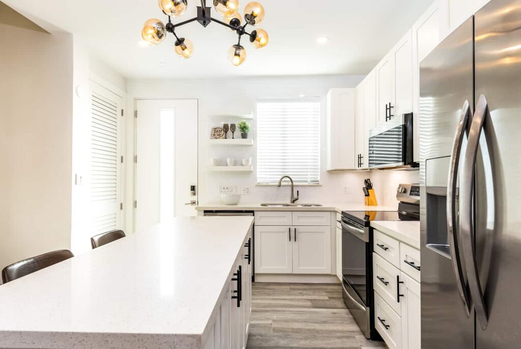 Upon entering the townhome, you'll be greeted by a spacious, open-concept living area featuring contemporary furnishings and abundant natural light. The living room is tastefully decorated, providing a cozy space for relaxation, while large glass doors lead to a private patio where you can take in the tropical breeze.