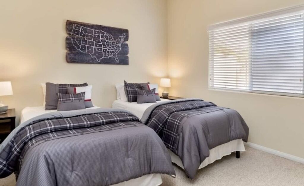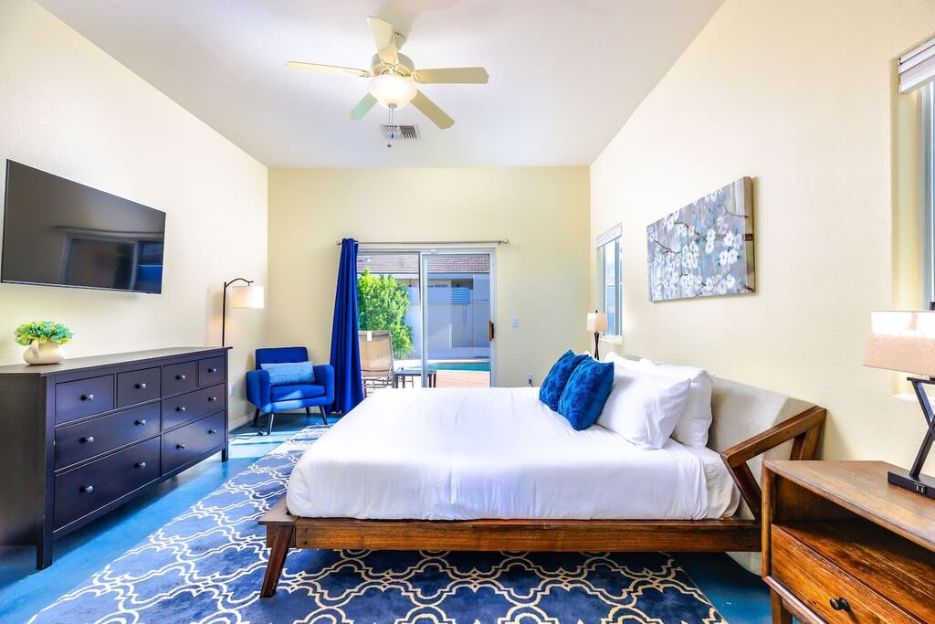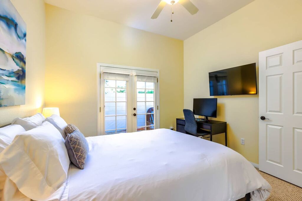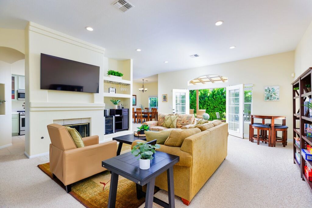 Retreat to the master suite, graced with a King bed, en-suite bath, and backyard access. An additional queen room and a double-twin room accommodate guests effortlessly.