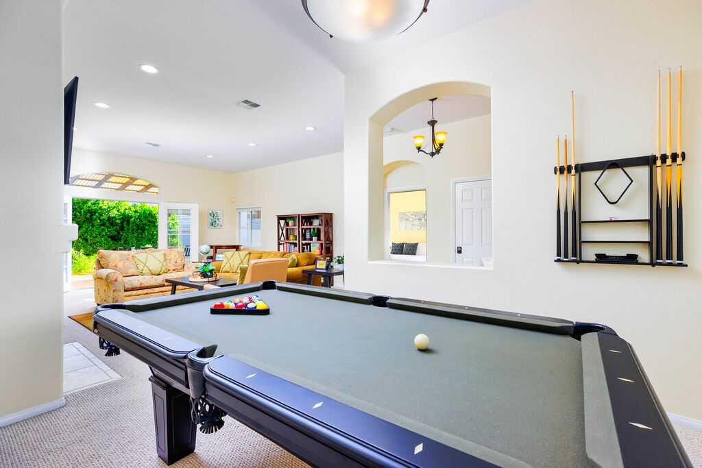 The open living area's soaring ceilings amplify the space and draw your gaze to a captivating fireplace and an accompanying pool table, setting the stage for relaxation and entertainment.