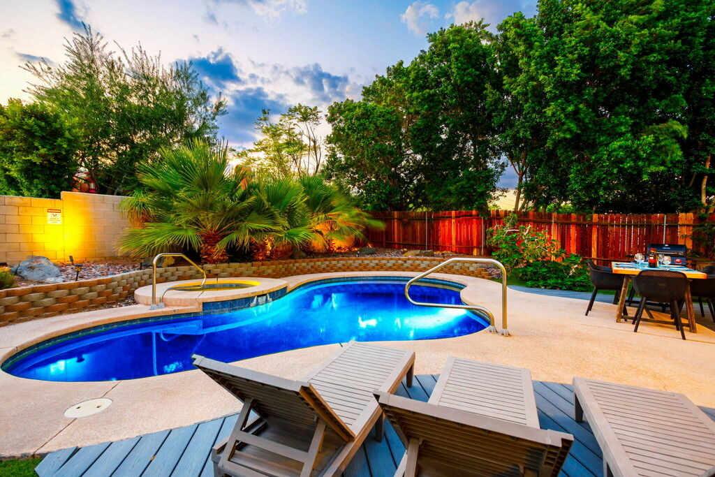 Outside, the backyard is the heart of the home. A private pool shimmers in the sunshine with a hot tub close by, both surrounded by loungers that add a little magic to the desert air. Evenings can be spent grilling under the stars, gathering with friends, or simply floating under the glow of the pool lights.
