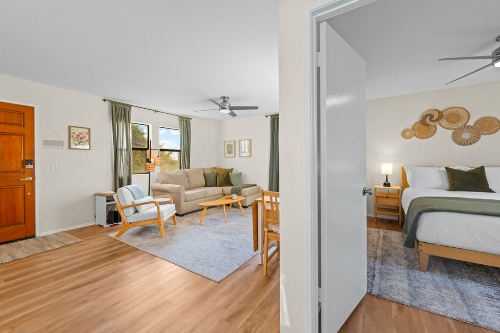 Step inside this bright and cozy retreat into the living room which invites you to curl up with a book, stream your favorite show on the flat-screen TV, or catch up on emails with high-speed Wi-Fi provided. Here, mornings are tranquil, afternoons are for lounging, and evenings are made for sharing stories of the day’s adventures.