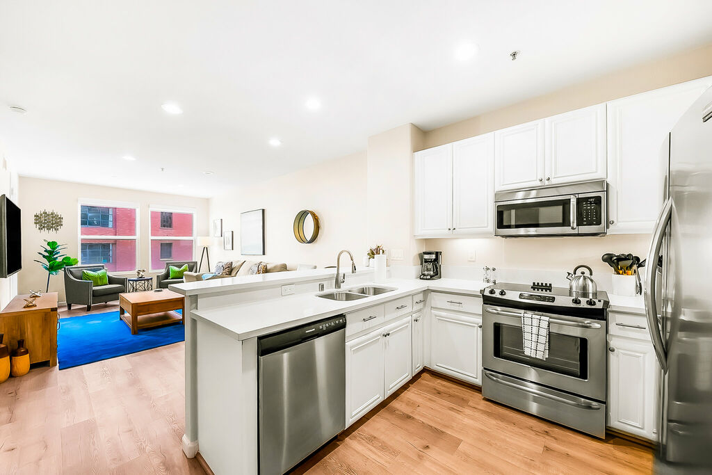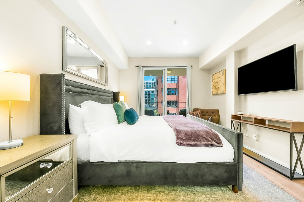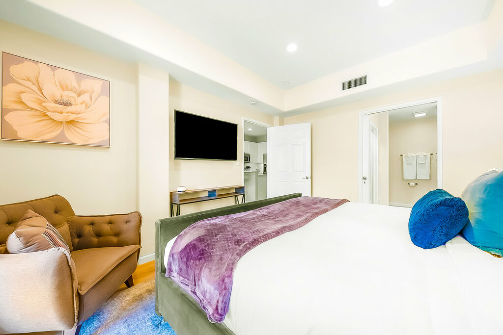 Step inside to a sleek, open layout featuring a contemporary kitchen with stainless steel appliances, a breakfast bar for extra seating, and in-unit laundry for ultimate convenience. The master suite boasts a king bed and a private balcony with stunning city skyline views, while the second bedroom offers a cozy queen bed.