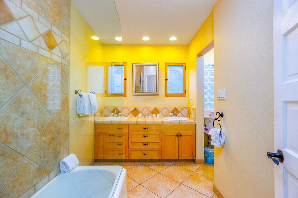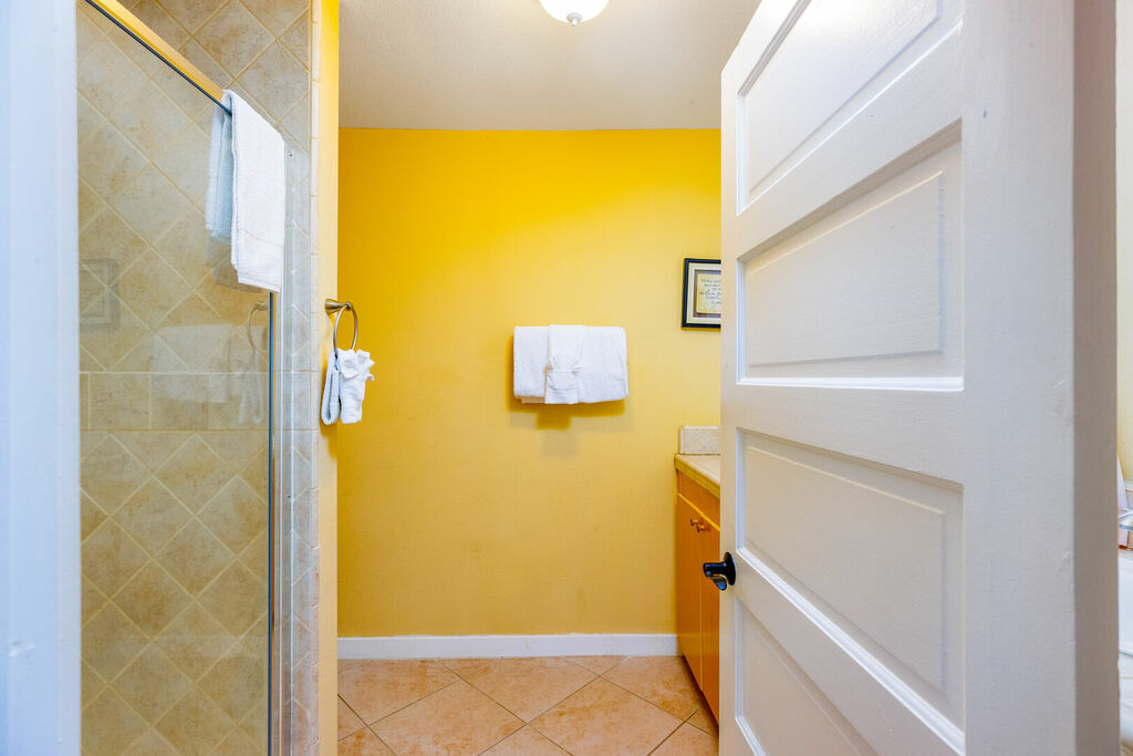 The master bedroom features a comfortable Queen bed and an ensuite bathroom with a spacious walk in shower, providing a private oasis for relaxation. Guest bedroom #1 also has a Queen bed, while guest bedroom #2 has a Full-sized bed. All bedrooms are tastefully decorated with comfortable bedding and ample storage.