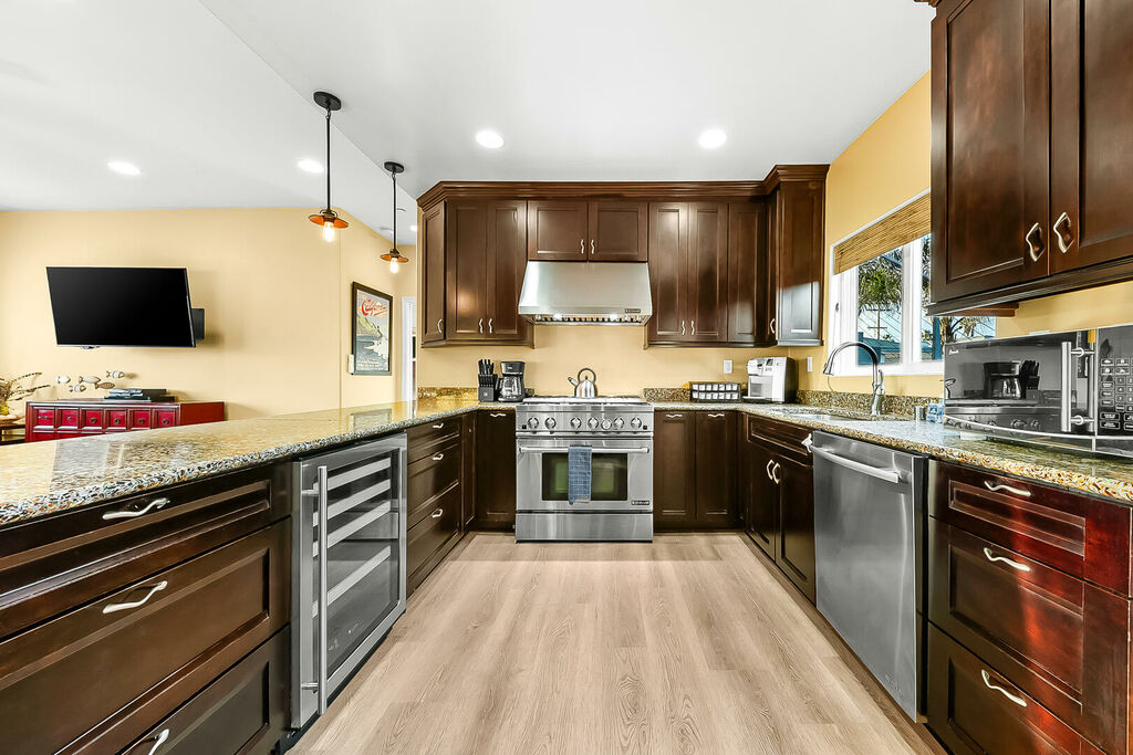 Inside, the bright and open living space features coastal-inspired décor, air conditioning, and modern comforts designed for a relaxing stay. The fully equipped kitchen showcases premium Viking appliances, making it easy to cook at home when you’re not exploring the neighborhood’s dining scene, and the in-unit washer and dryer keep beach days effortless. The spacious primary suite offers a plush king bed, generous storage, and a private ensuite bath complete with a soaking tub, standing shower, and separate water closet, while a convenient half bath in the hallway adds extra comfort for guests.