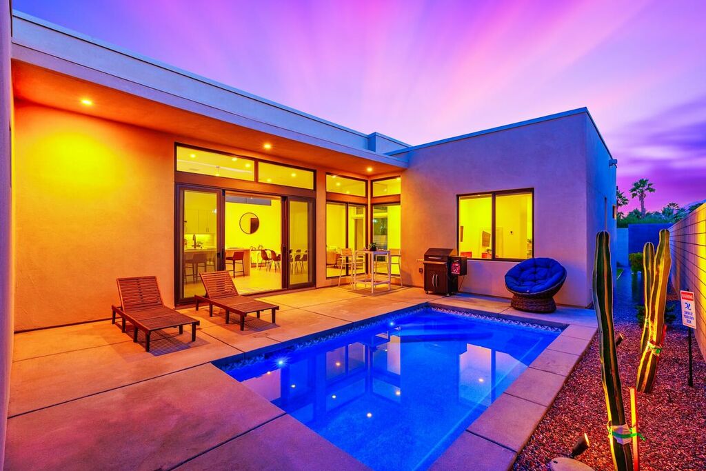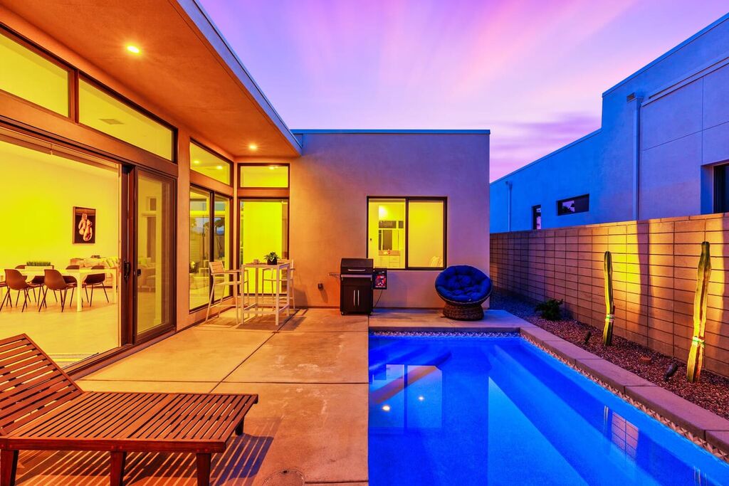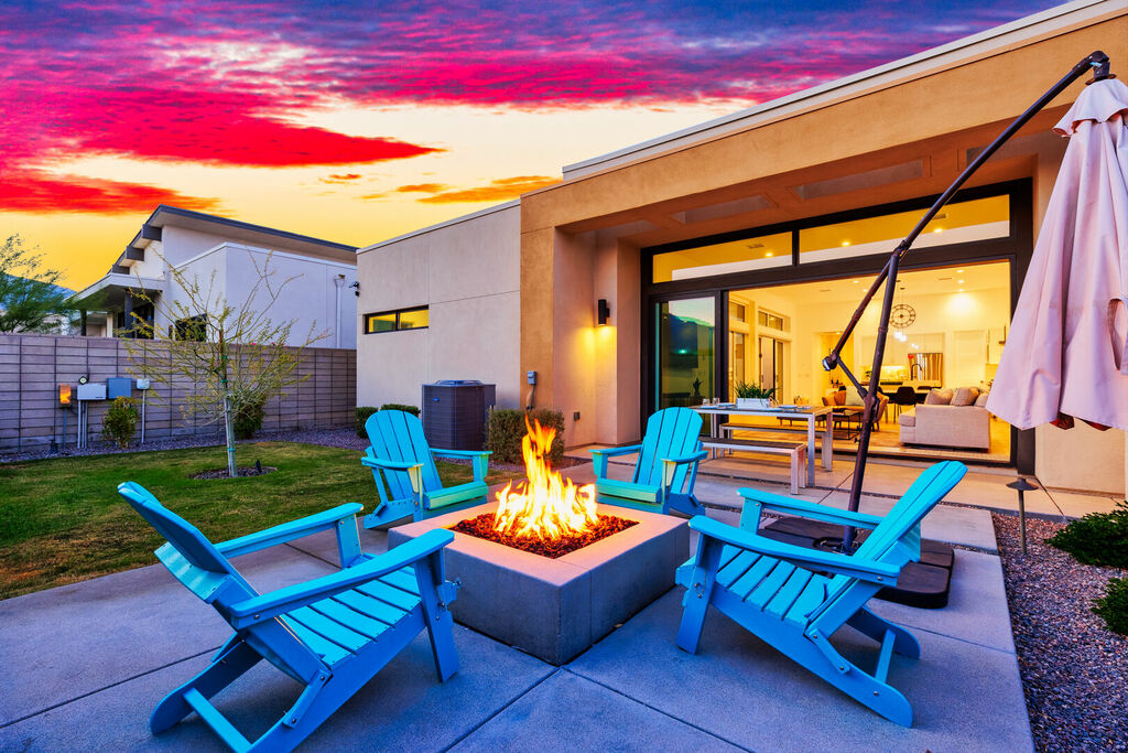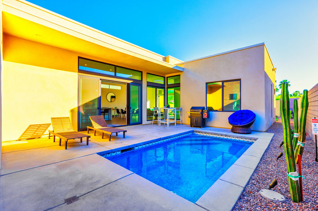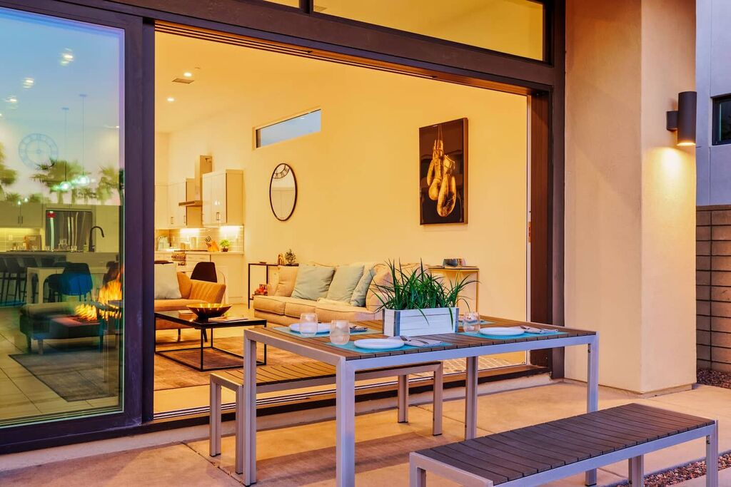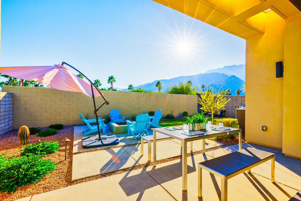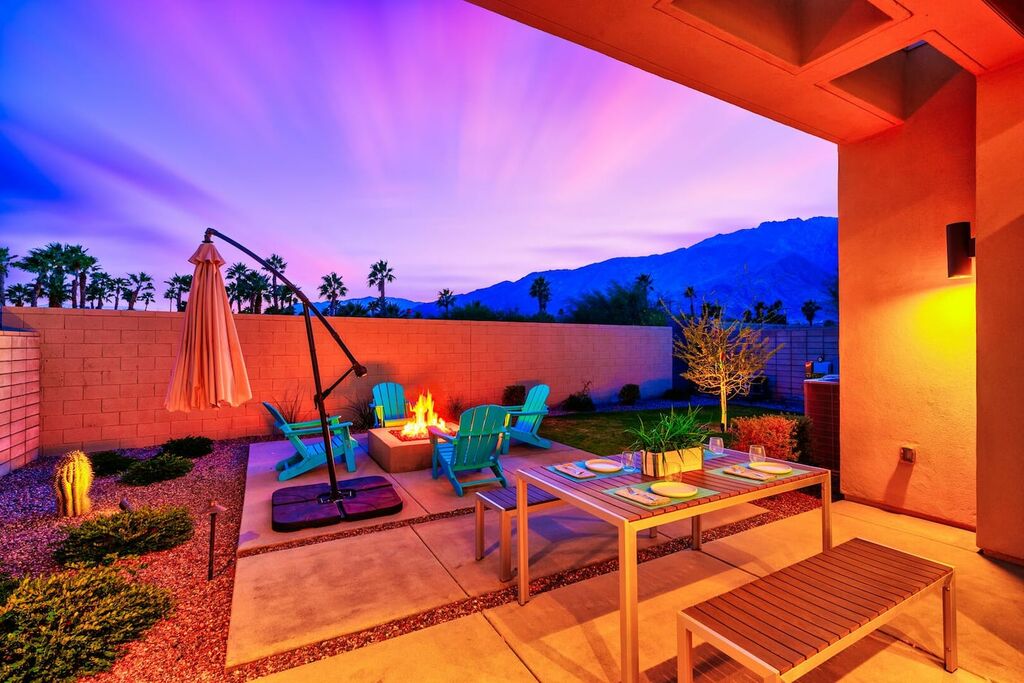 Surrounded by breathtaking vistas of the San Jacinto Mountains, the fenced yard stands as a haven for your entire group, furry friends included. Spend leisurely mornings lounging by the private pool before firing up the gas grill for an afternoon barbecue at the outdoor dining table. As dusk falls, witness the stars emerge while indulging in s'mores around the firepit.