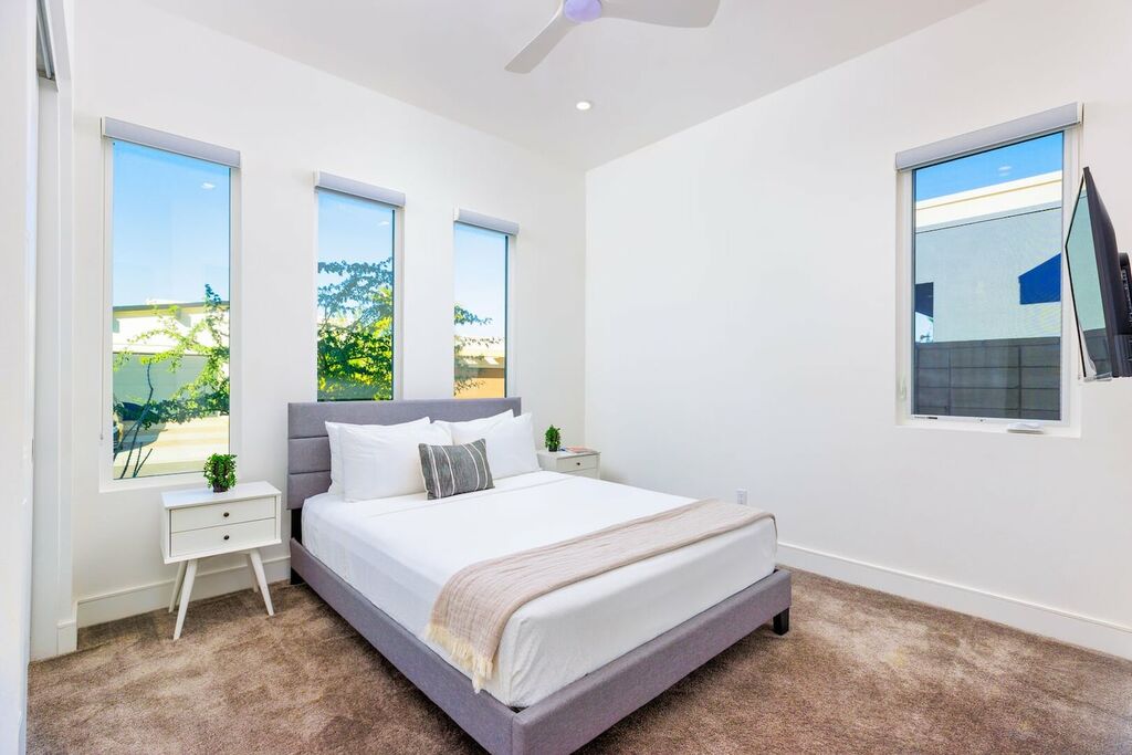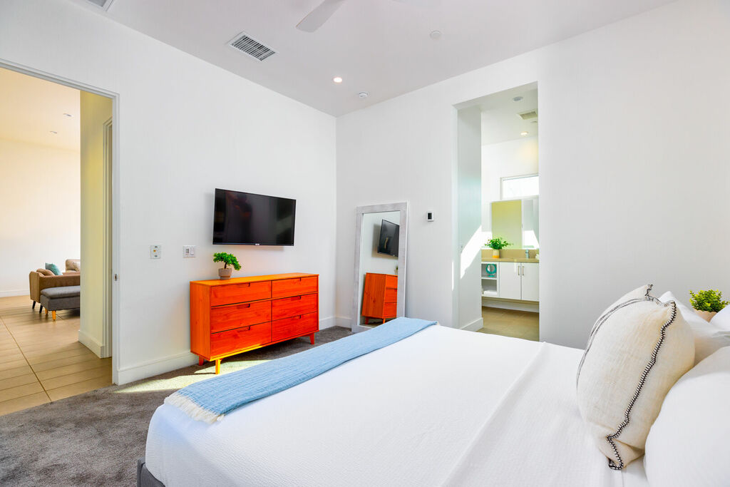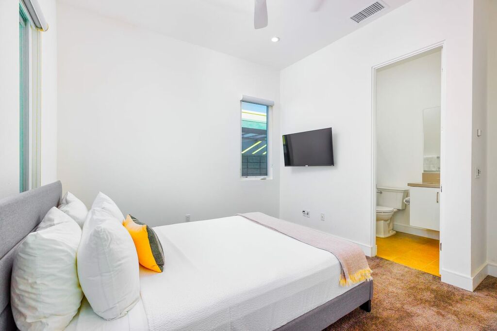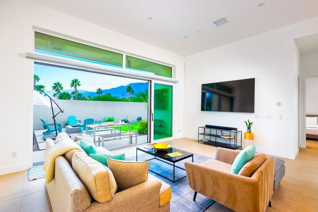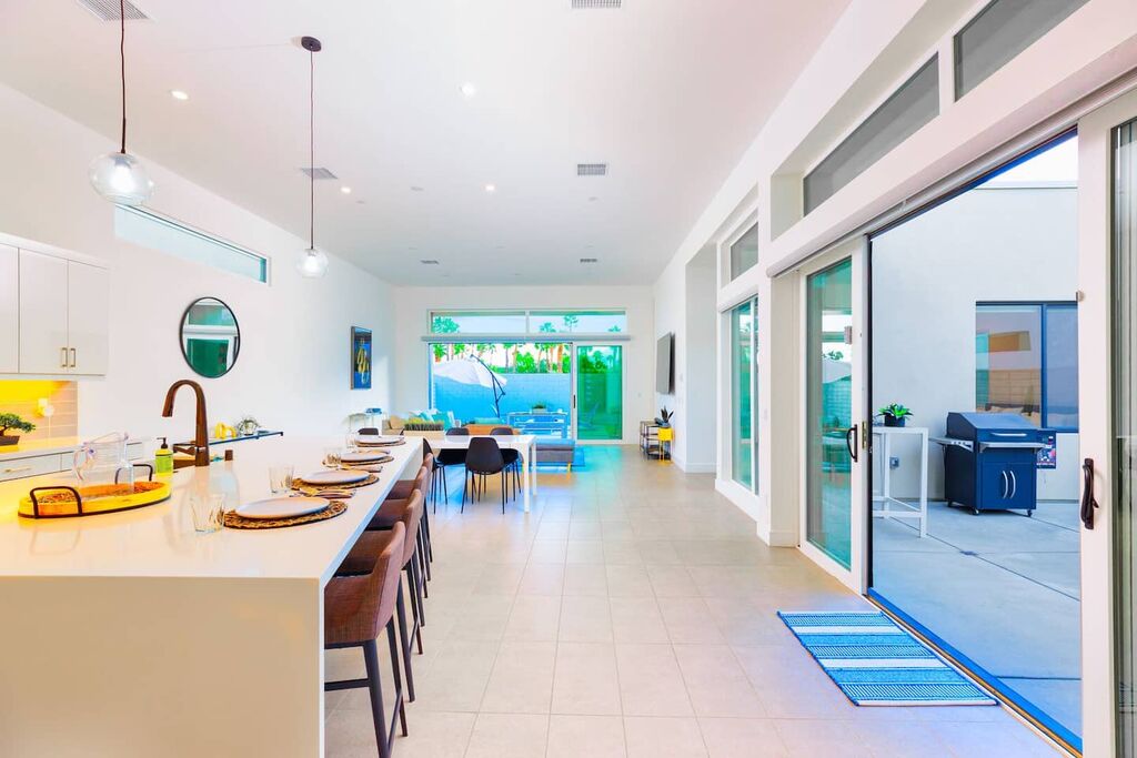 Boasting a mid-modern design and an inviting open layout, this home ensures comfort at every turn. Bask in the sunlight flooding through the high ceilings of the living room, perfect for unwinding with a favorite book or indulging in entertainment on the smart TV. The spacious kitchen, complete with a sizable island accommodating four, stainless steel appliances, and a wine fridge, caters to the culinary aficionado in your group. An adjacent dining table comfortably seats six, ideal for shared meals or lively board game nights.