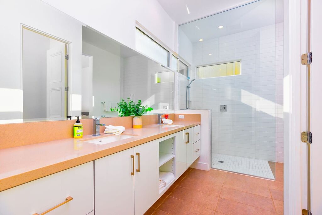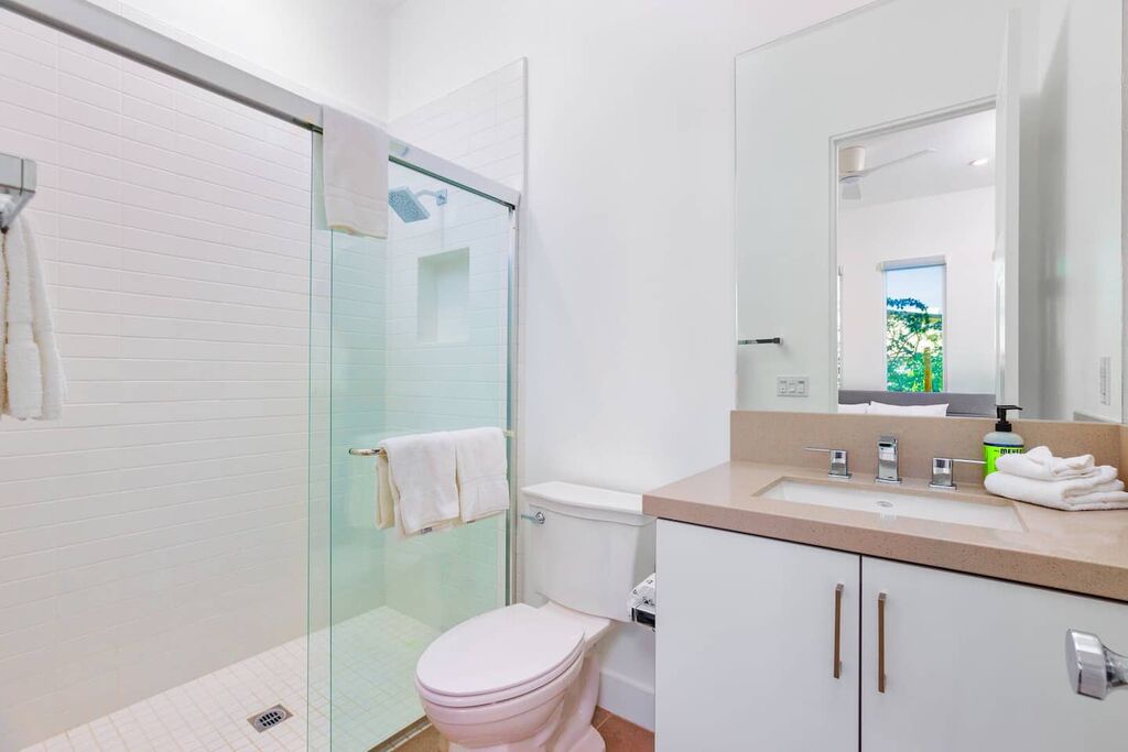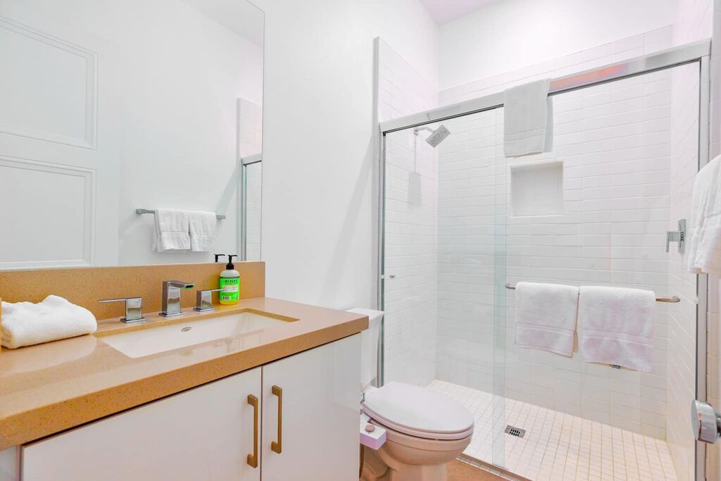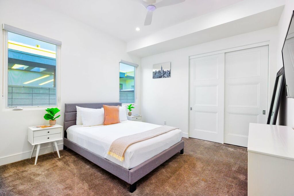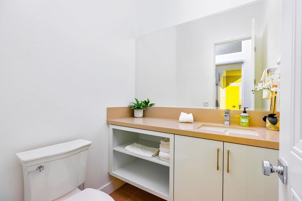 Boasting a mid-modern design and an inviting open layout, this home ensures comfort at every turn. Bask in the sunlight flooding through the high ceilings of the living room, perfect for unwinding with a favorite book or indulging in entertainment on the smart TV. The spacious kitchen, complete with a sizable island accommodating four, stainless steel appliances, and a wine fridge, caters to the culinary aficionado in your group. An adjacent dining table comfortably seats six, ideal for shared meals or lively board game nights.