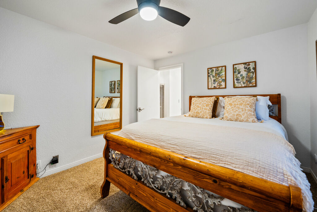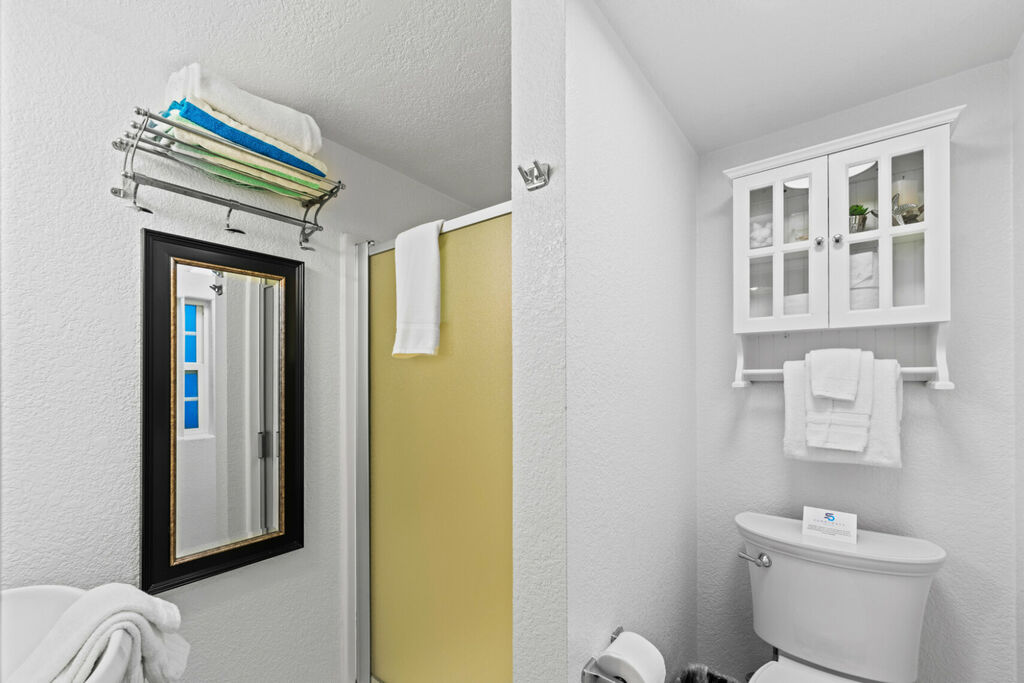 The master bedroom boasts a queen bed and a private ensuite bathroom, while the guest bedroom also offers a plush queen bed, ensuring that everyone has their own space to recharge after a day of beach adventures.