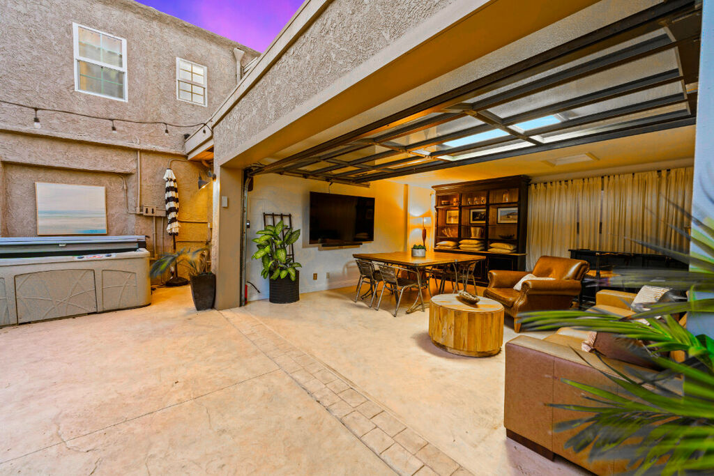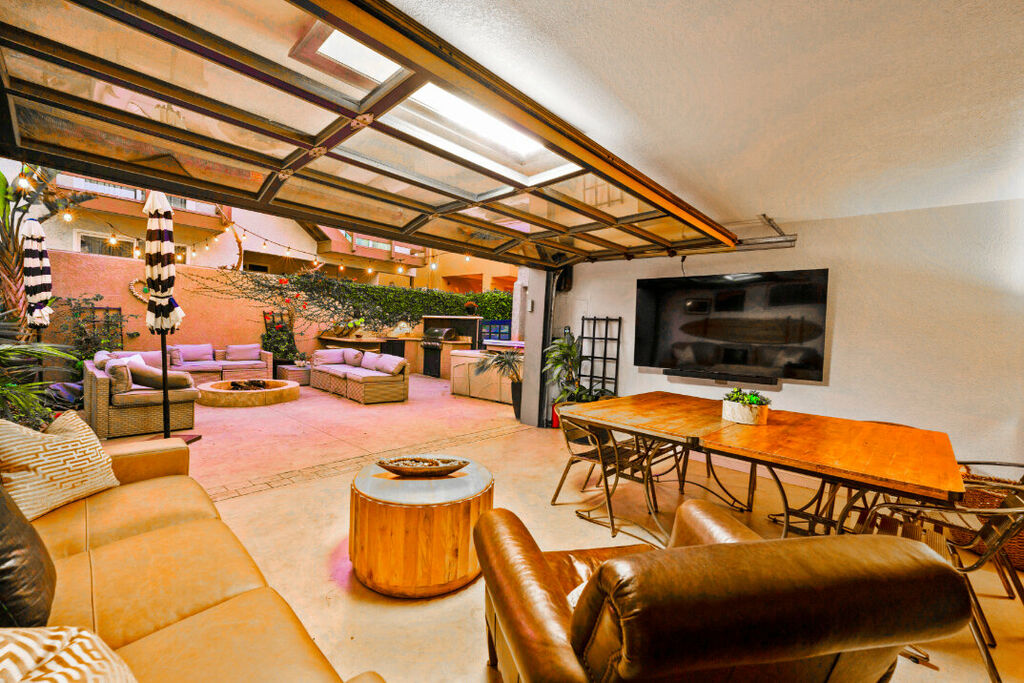 Outside, the magic continues with a spacious covered cabana featuring a massive 75-inch TV, perfect for outdoor movie nights or catching the big game. There’s also a large dining table and an inviting outdoor couch, making it the ideal spot for alfresco dining or just lounging with a drink in hand. Nearby, you'll find a cozy firepit with ample seating, where you can gather under the stars for s’mores or an evening glass of wine. And for the grill enthusiast, the outdoor kitchen comes equipped with a built-in barbecue and bar area.