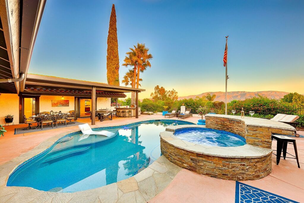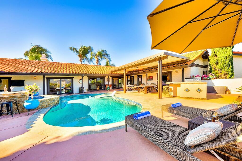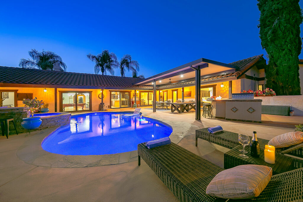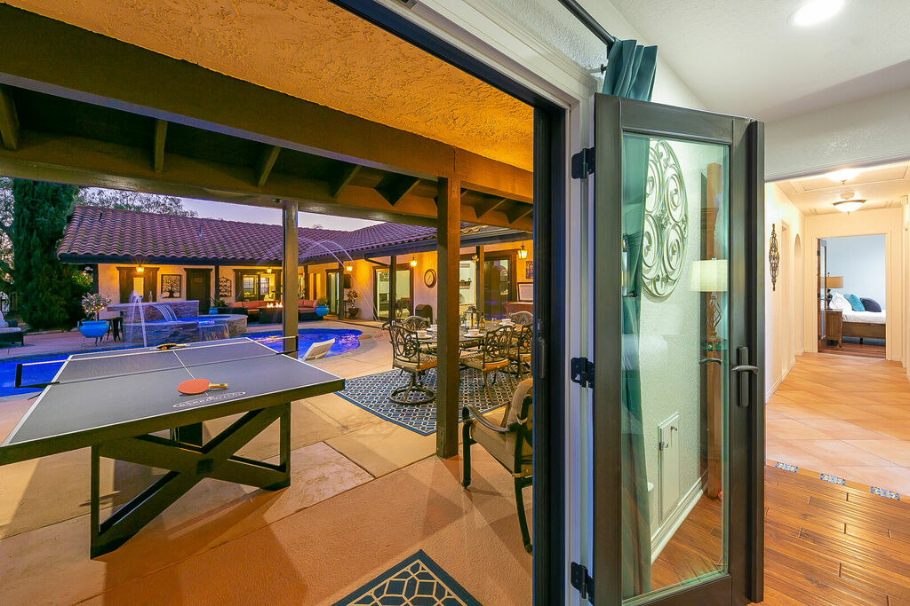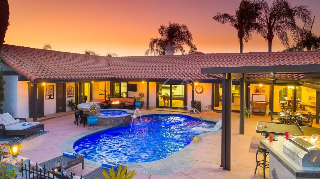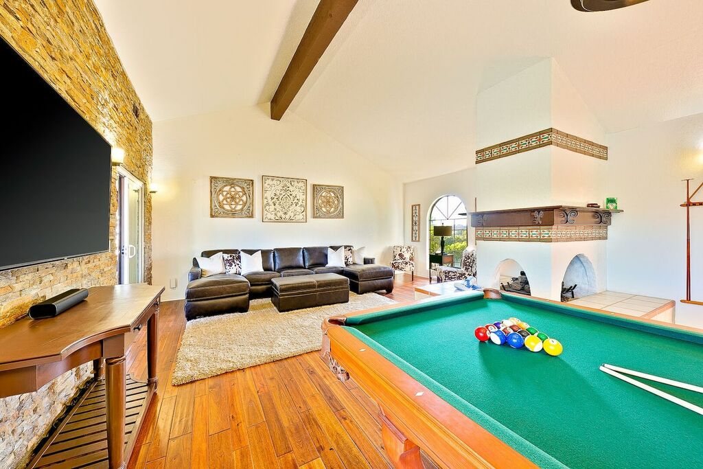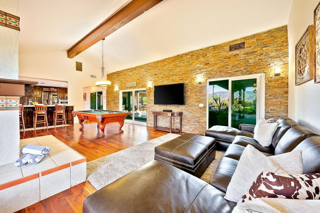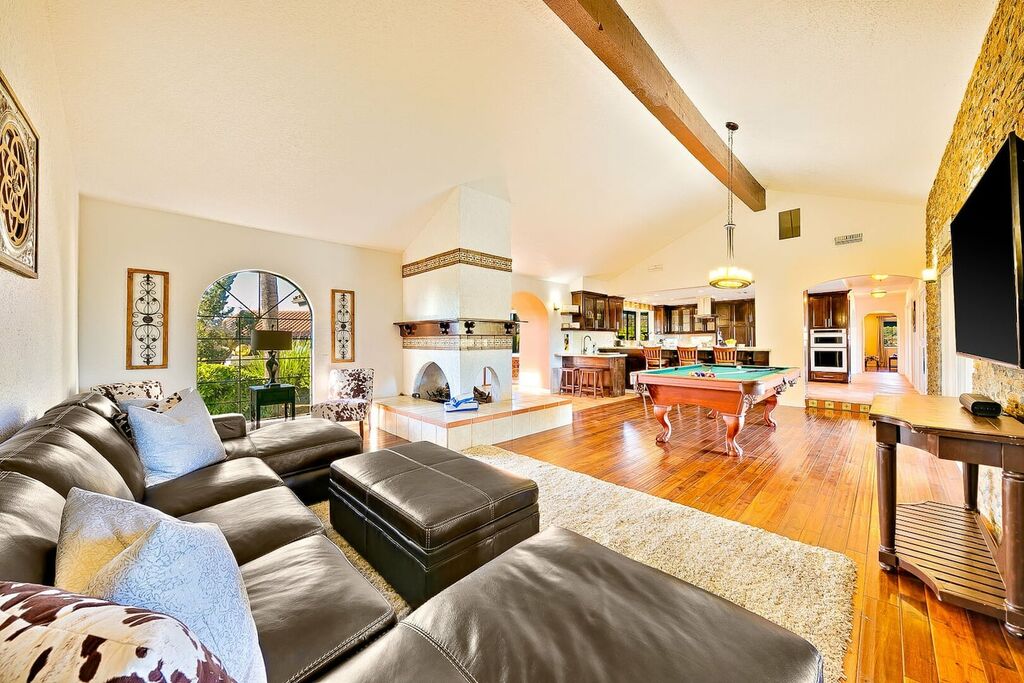 This 5 bedroom (7 beds, 1 King Bed and 6 Queen Beds) home wraps around the backyard, so almost every area of the house enjoys pool and spa views. In the luxe backyard, you can enjoy plenty of lounge chairs for sunbathing or shade for sleeping. There is a custom outdoor Ping-Pong table or enjoy the Jacuzzi-Bar. Inside the pool, you will find built-in bar stools. This private estate is surrounded by mature landscaping and citrus trees that perfume the property in springtime. The house and backyard are invisible from the street level and neighboring residences. This beautifully renovated home boasts a grand entrance at the top of the privately gated driveway. The great room features vaulted ceilings, a pool table, a wet bar, and counter seating that allows pass-through entertaining from the kitchen to the pool table and TV rooms.