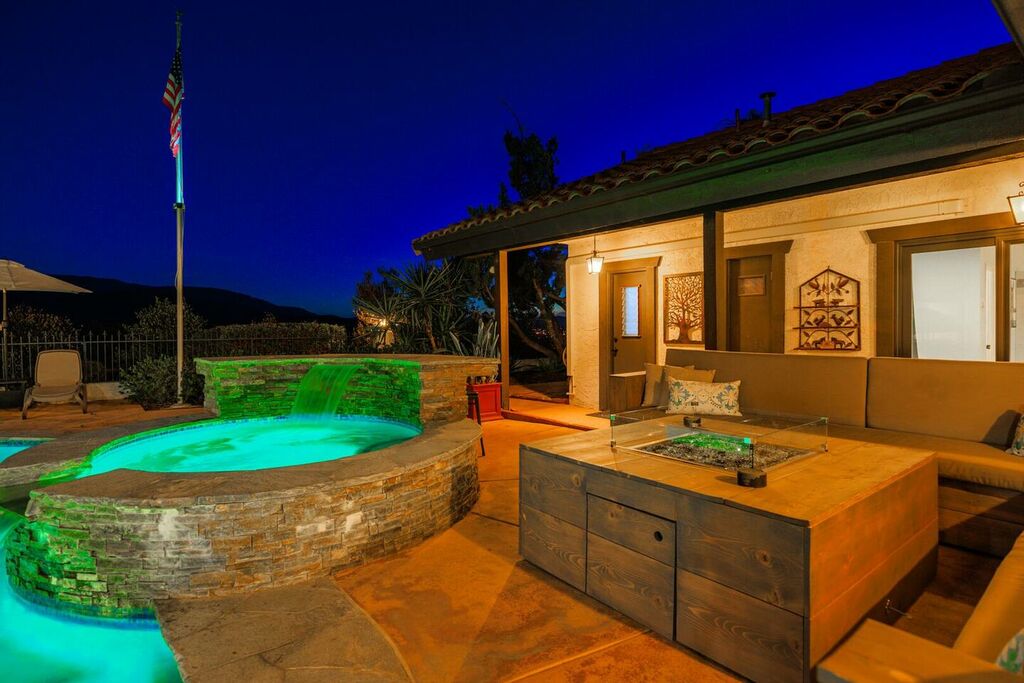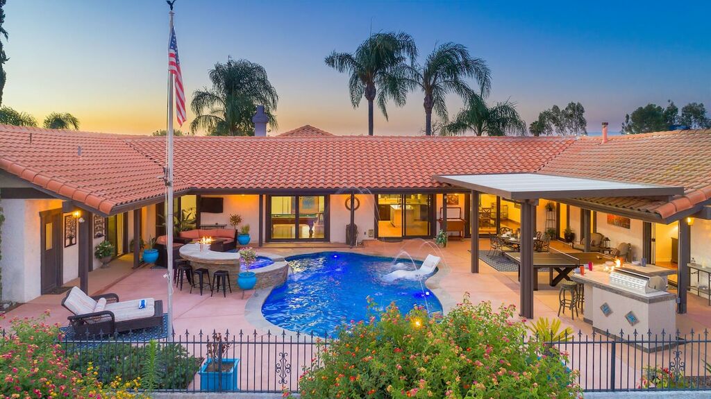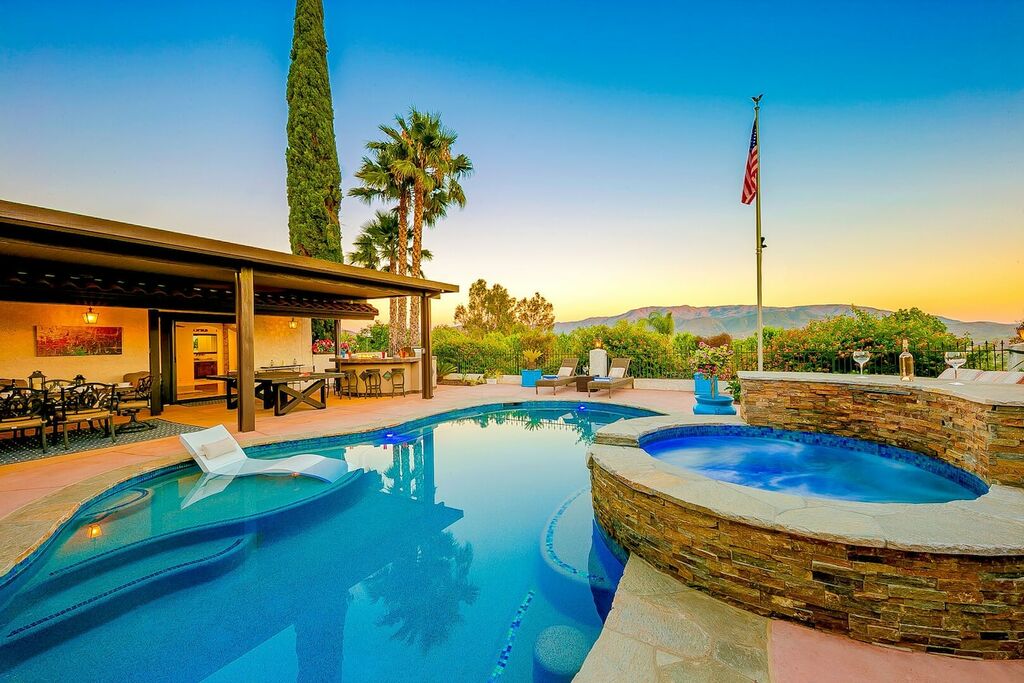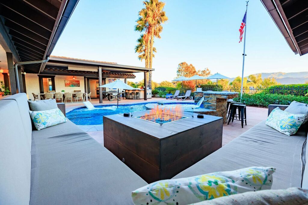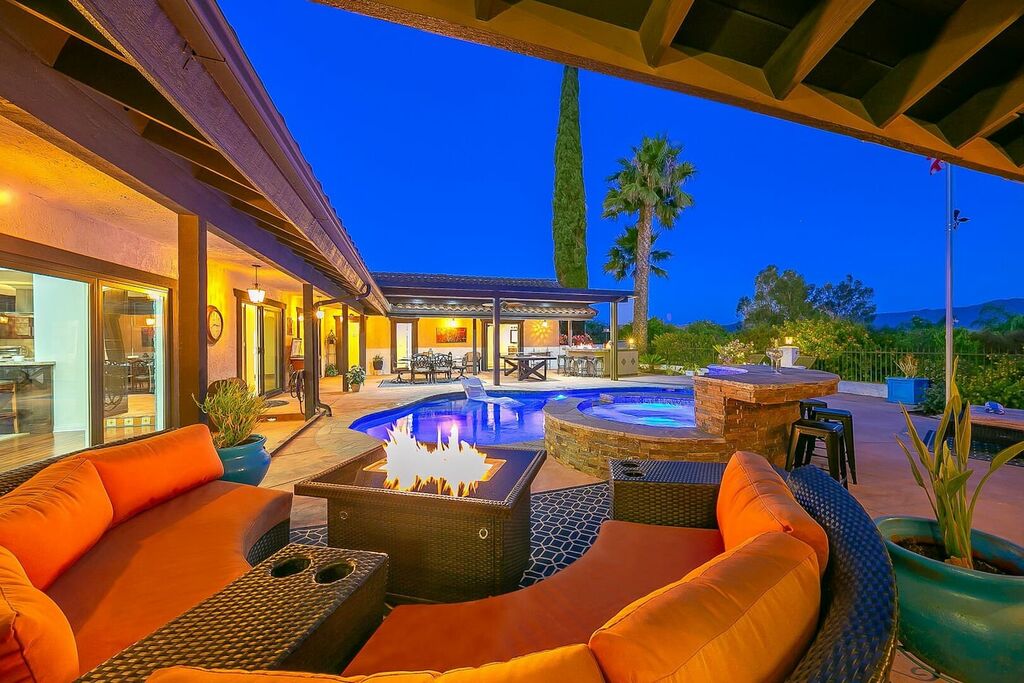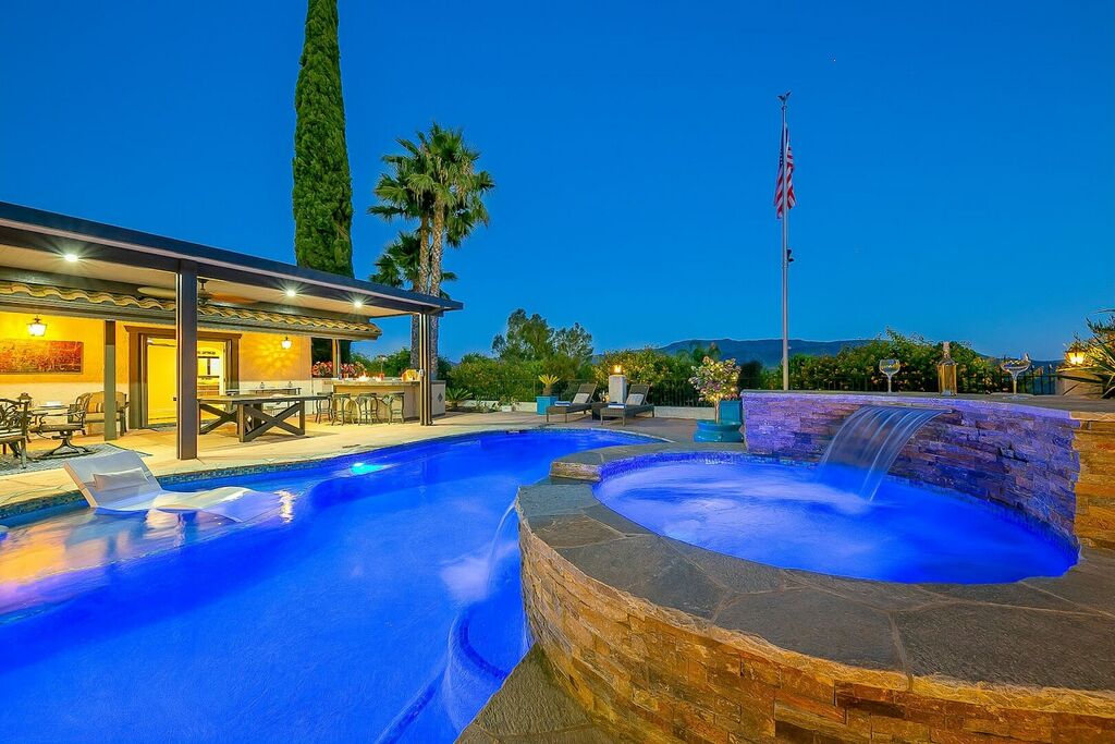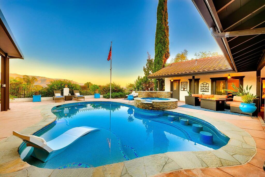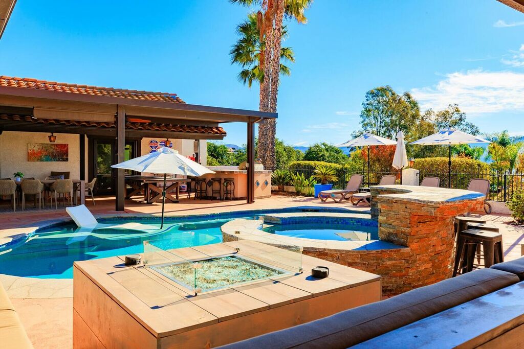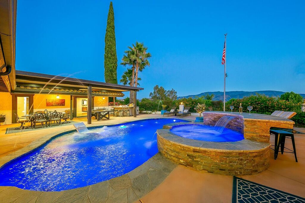 This 5 bedroom (7 beds, 1 King Bed and 6 Queen Beds) home wraps around the backyard, so almost every area of the house enjoys pool and spa views. In the luxe backyard, you can enjoy plenty of lounge chairs for sunbathing or shade for sleeping. There is a custom outdoor Ping-Pong table or enjoy the Jacuzzi-Bar. Inside the pool, you will find built-in bar stools. This private estate is surrounded by mature landscaping and citrus trees that perfume the property in springtime. The house and backyard are invisible from the street level and neighboring residences. This beautifully renovated home boasts a grand entrance at the top of the privately gated driveway. The great room features vaulted ceilings, a pool table, a wet bar, and counter seating that allows pass-through entertaining from the kitchen to the pool table and TV rooms.