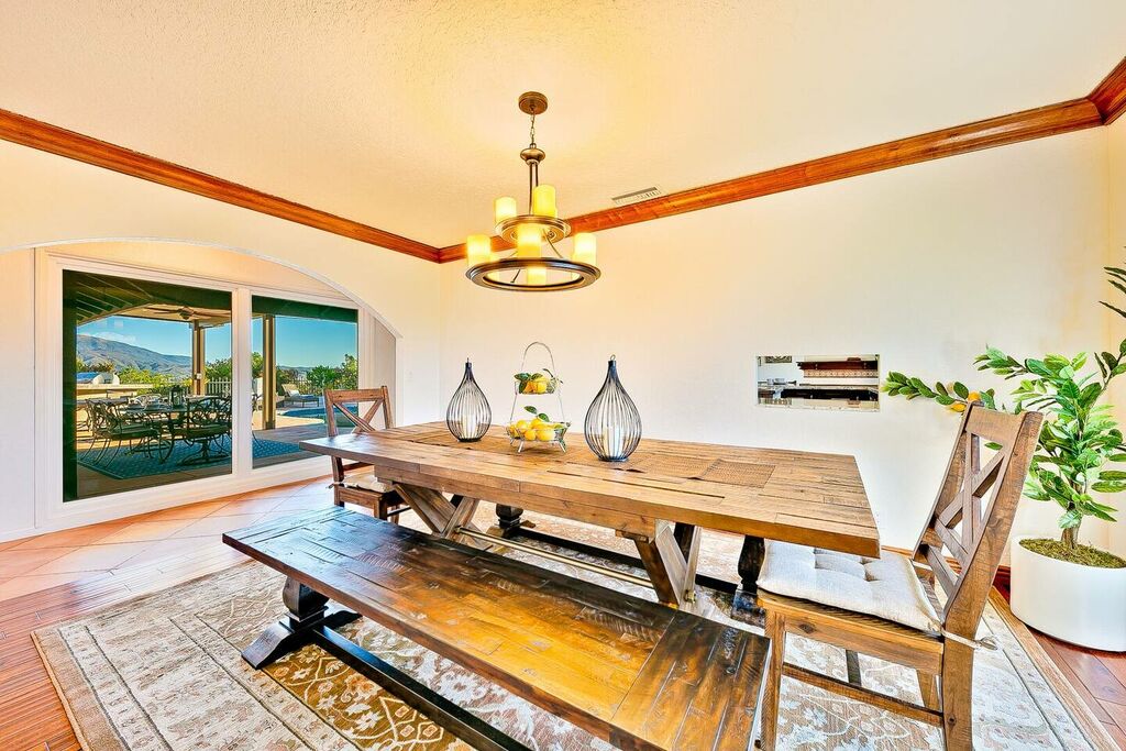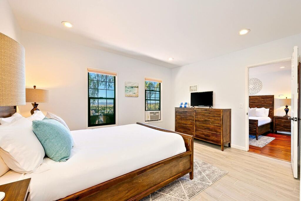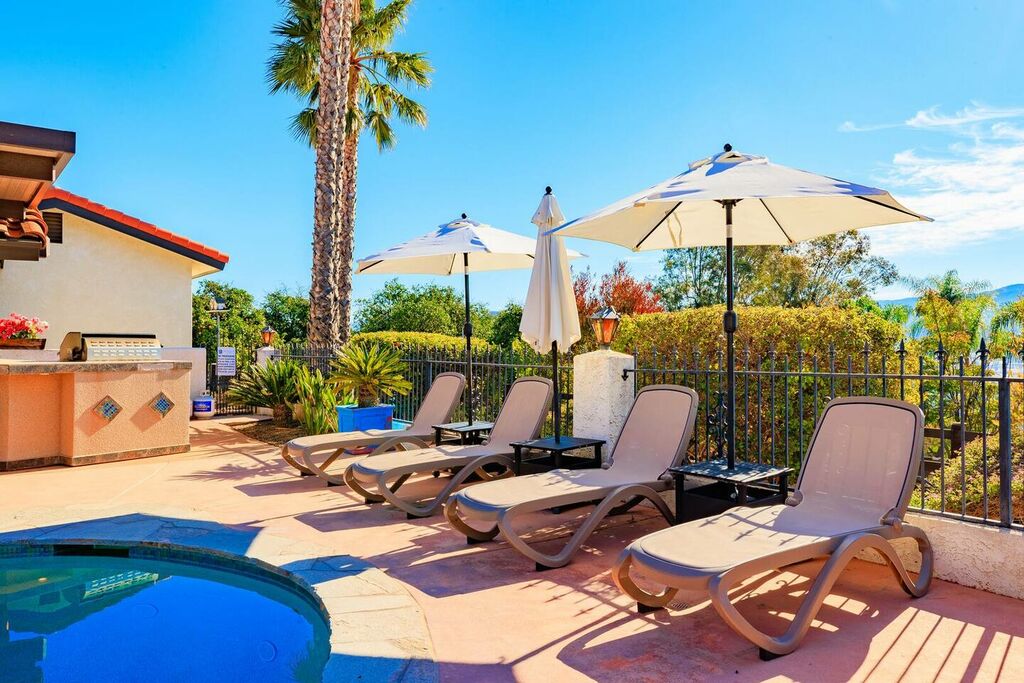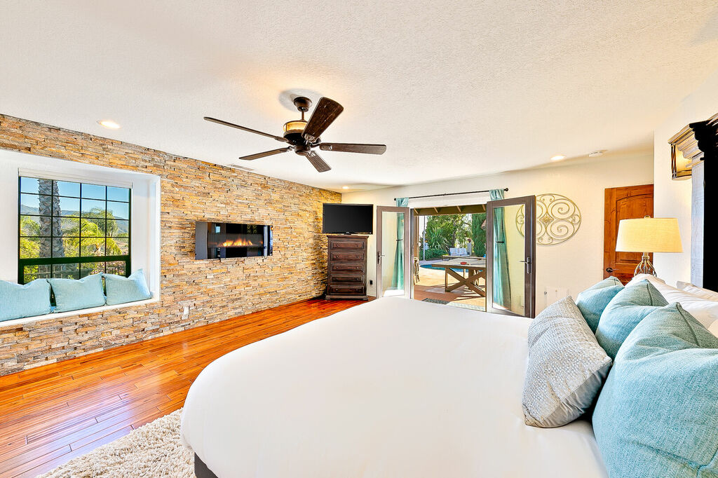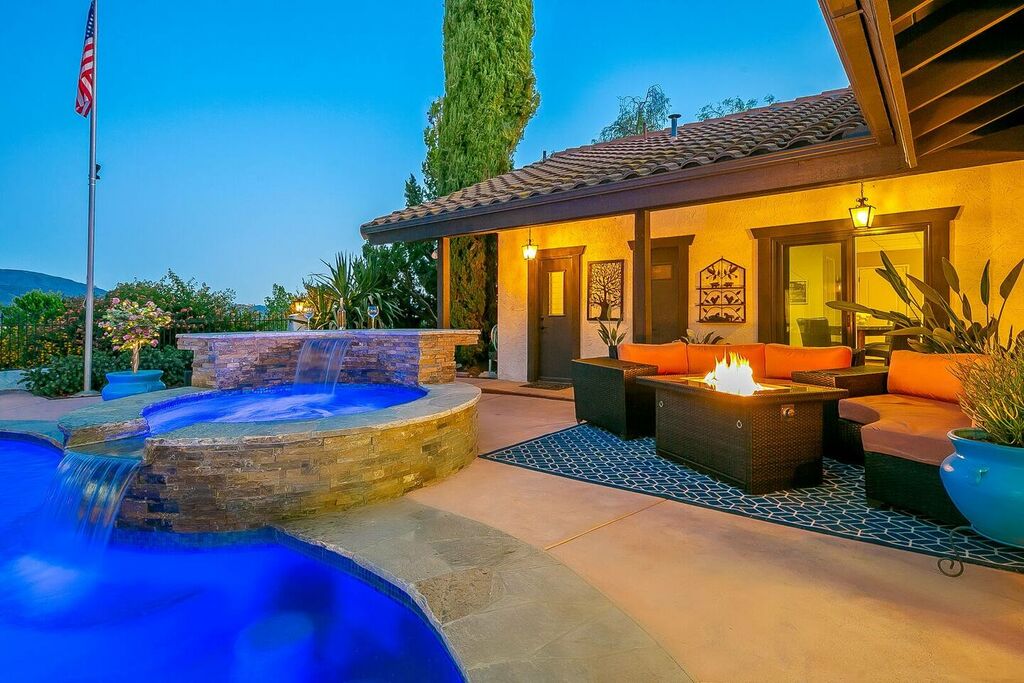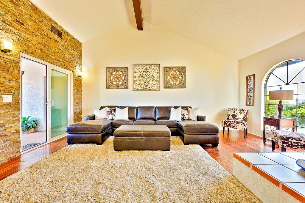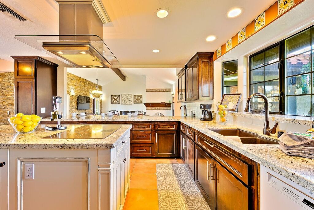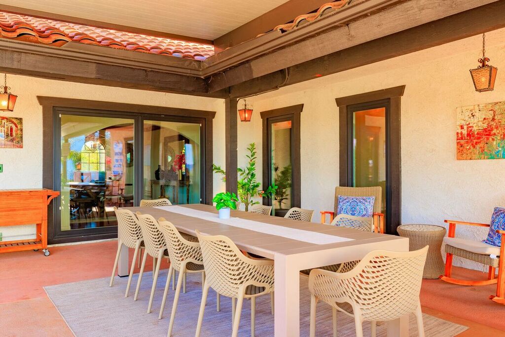 This 5 bedroom (7 beds, 1 King Bed and 6 Queen Beds) home wraps around the backyard, so almost every area of the house enjoys pool and spa views. In the luxe backyard, you can enjoy plenty of lounge chairs for sunbathing or shade for sleeping. There is a custom outdoor Ping-Pong table or enjoy the Jacuzzi-Bar. Inside the pool, you will find built-in bar stools. This private estate is surrounded by mature landscaping and citrus trees that perfume the property in springtime. The house and backyard are invisible from the street level and neighboring residences. This beautifully renovated home boasts a grand entrance at the top of the privately gated driveway. The great room features vaulted ceilings, a pool table, a wet bar, and counter seating that allows pass-through entertaining from the kitchen to the pool table and TV rooms.