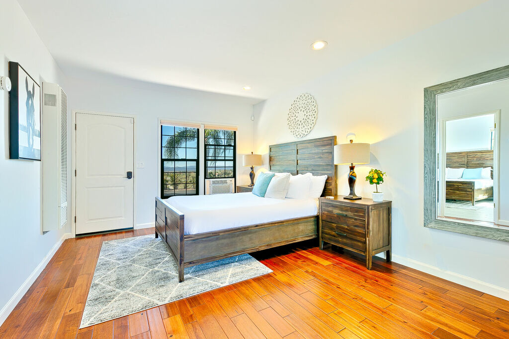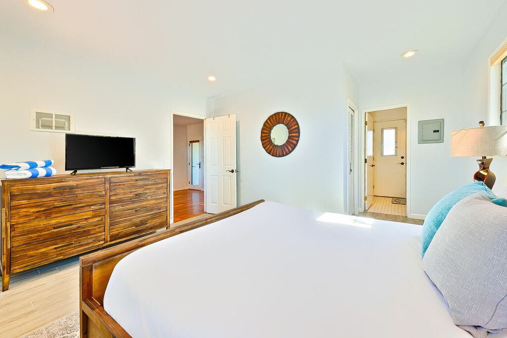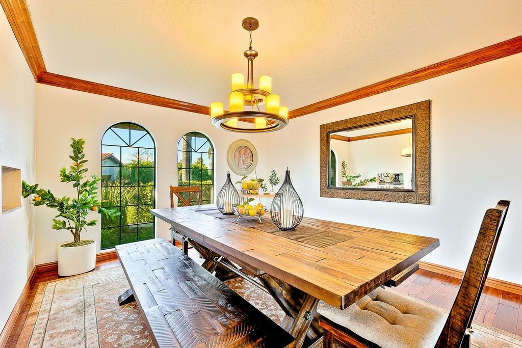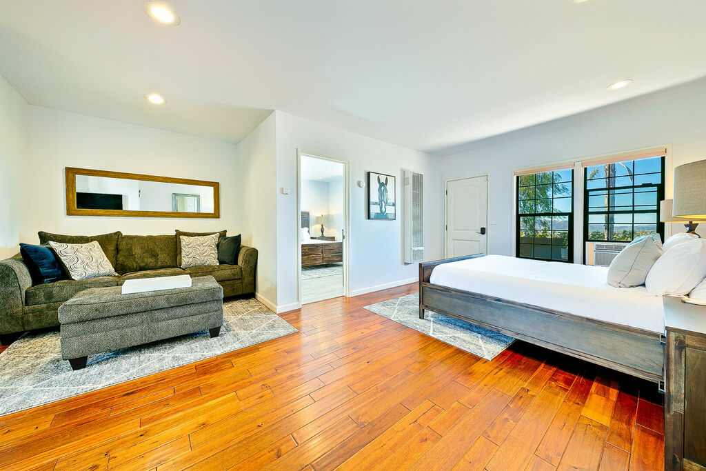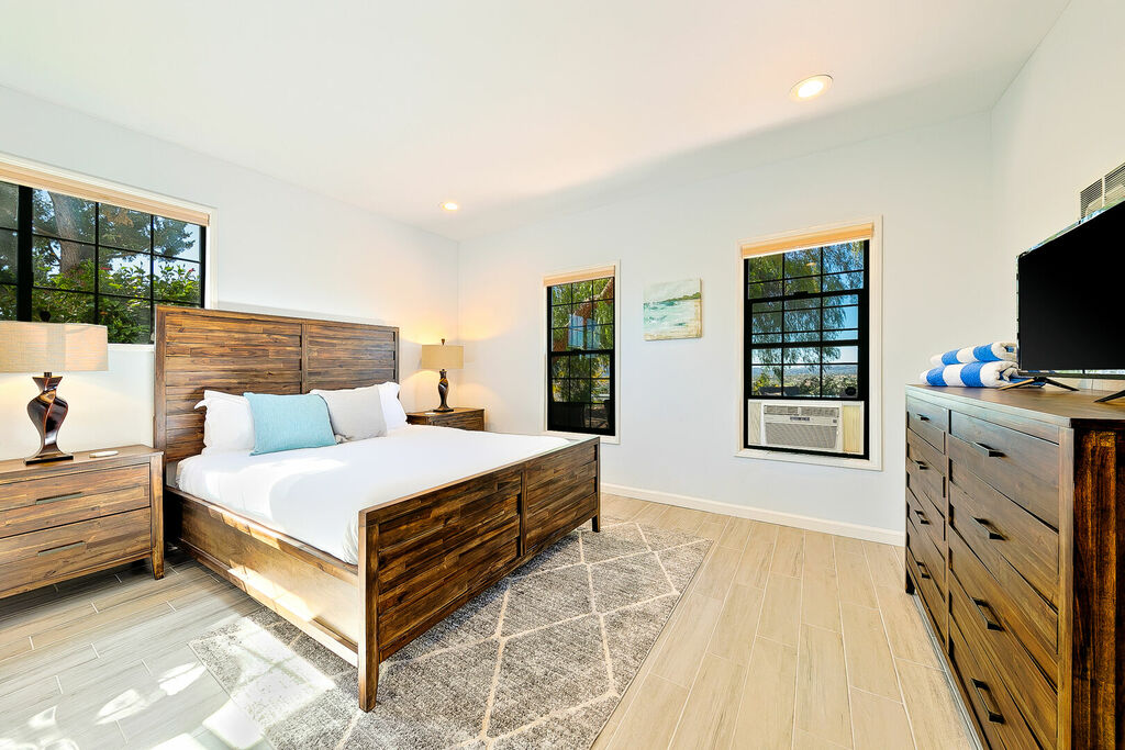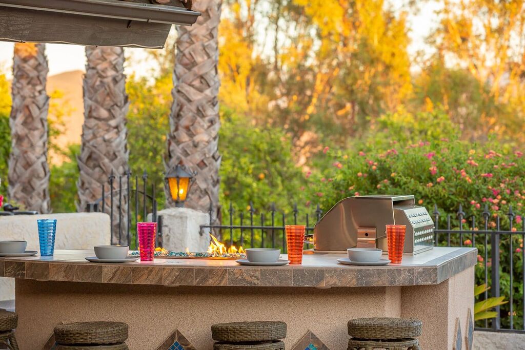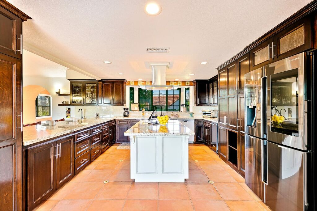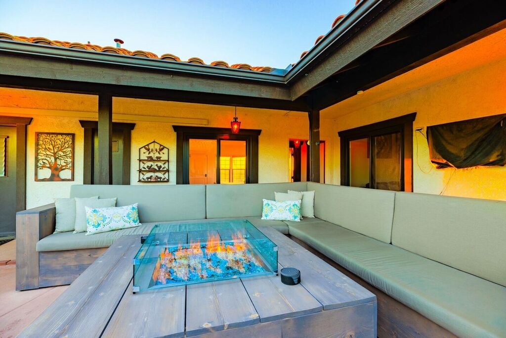 This 5 bedroom (7 beds, 1 King Bed and 6 Queen Beds) home wraps around the backyard, so almost every area of the house enjoys pool and spa views. In the luxe backyard, you can enjoy plenty of lounge chairs for sunbathing or shade for sleeping. There is a custom outdoor Ping-Pong table or enjoy the Jacuzzi-Bar. Inside the pool, you will find built-in bar stools. This private estate is surrounded by mature landscaping and citrus trees that perfume the property in springtime. The house and backyard are invisible from the street level and neighboring residences. This beautifully renovated home boasts a grand entrance at the top of the privately gated driveway. The great room features vaulted ceilings, a pool table, a wet bar, and counter seating that allows pass-through entertaining from the kitchen to the pool table and TV rooms.