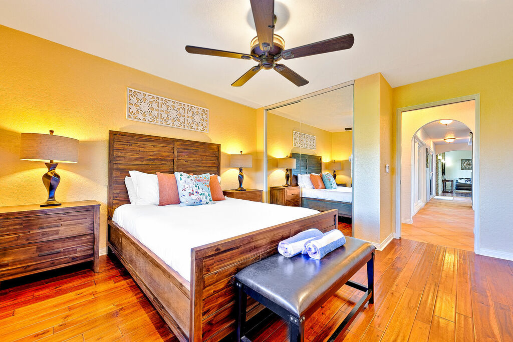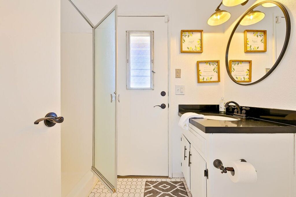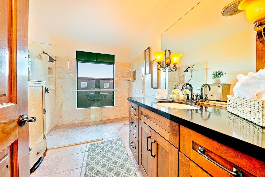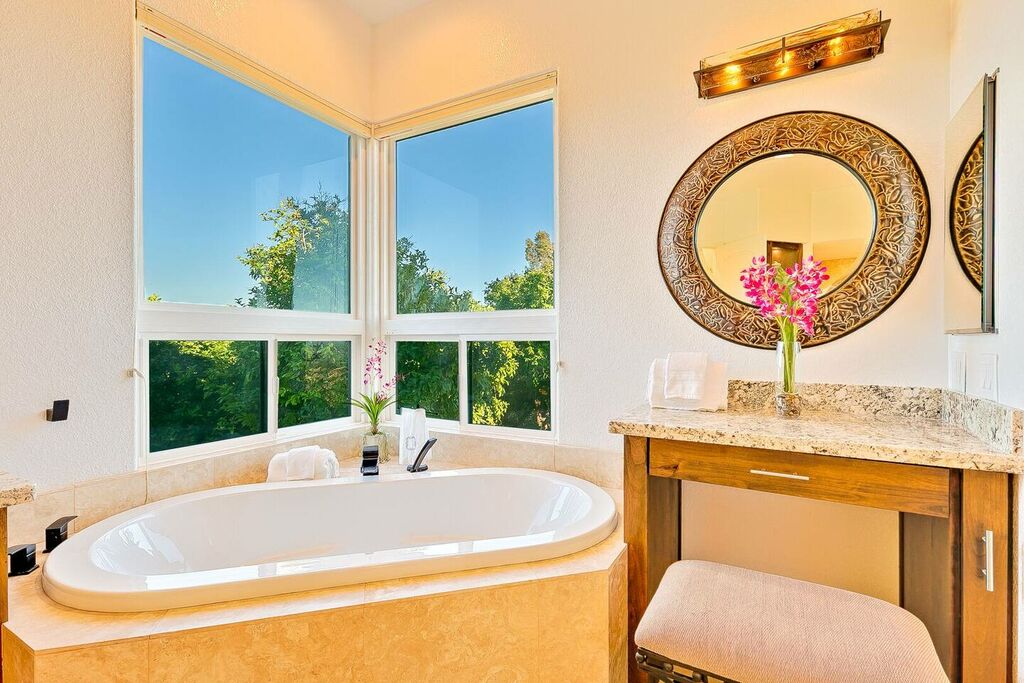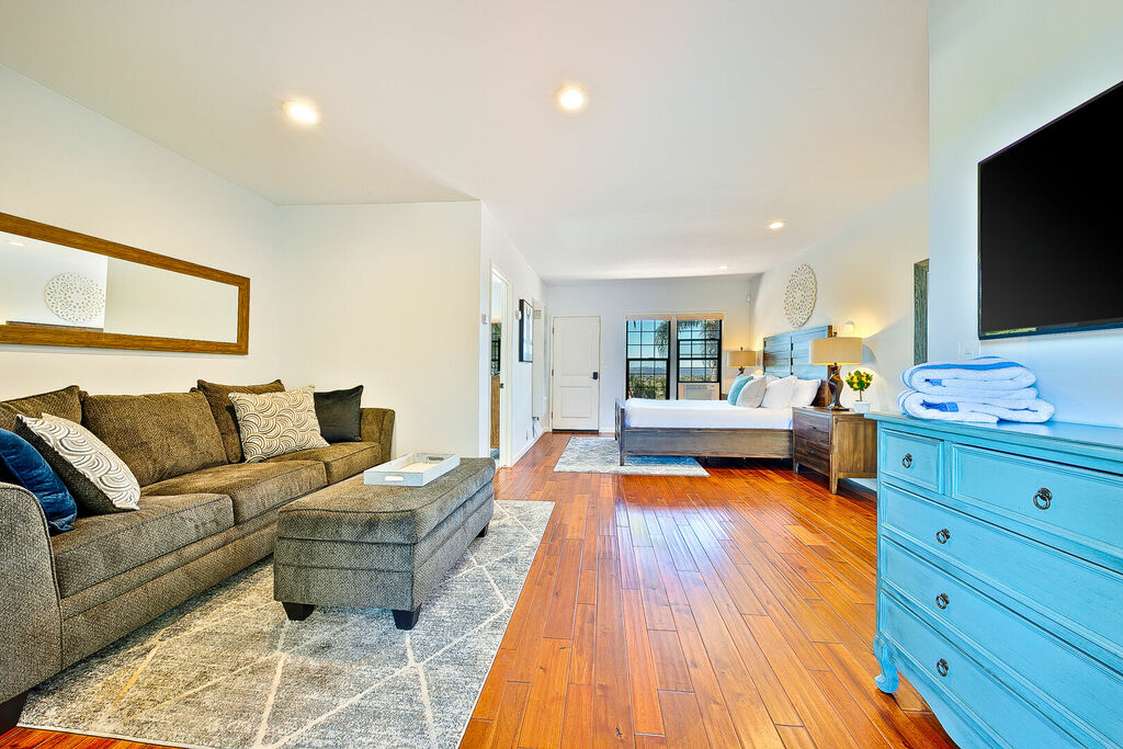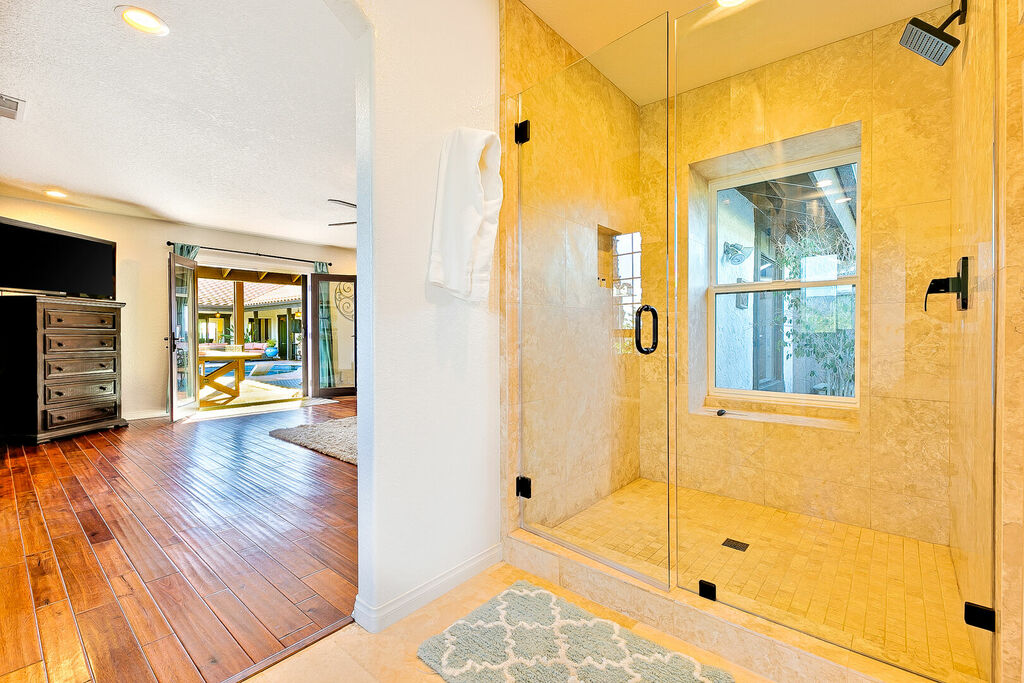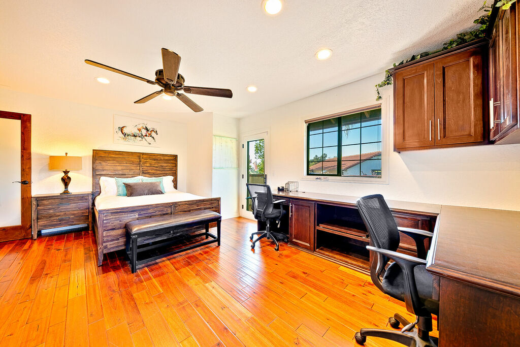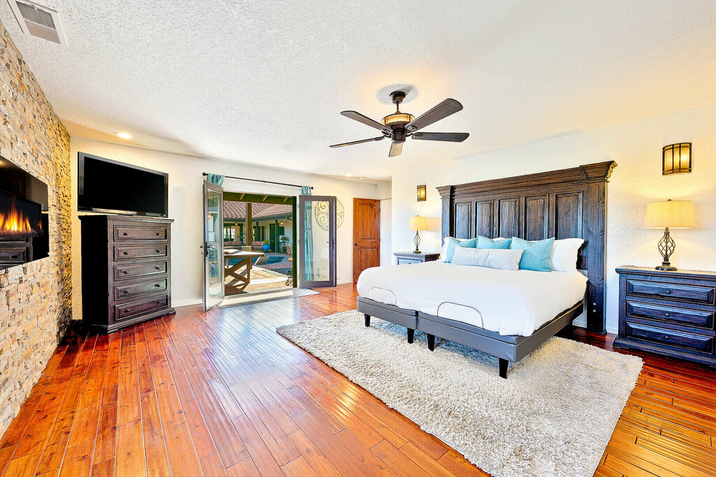 The primary bedroom has a private entrance to the pool area and a jetted bathtub inside the oversized main bathroom. The Whole-house fan keeps the house nicely cool in the morning and into the early afternoon, and when needed, you can flip on the air-conditioning. In winter, the electric faux fireplace keeps the main bedroom toasty warm. A secondary living room allows for extra entertaining in the attached two-bedroom guesthouse.