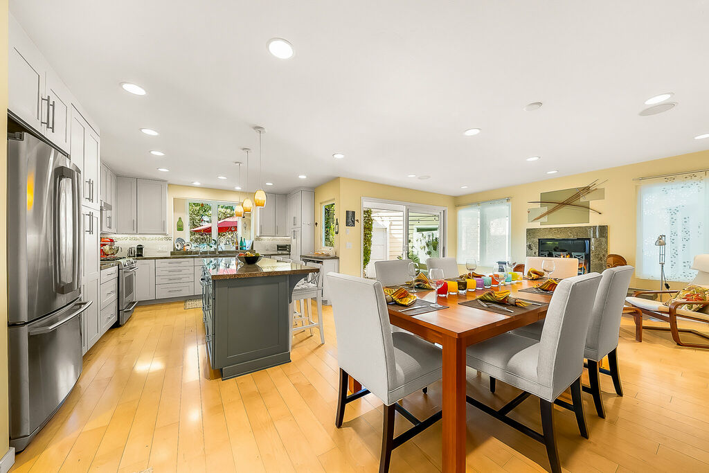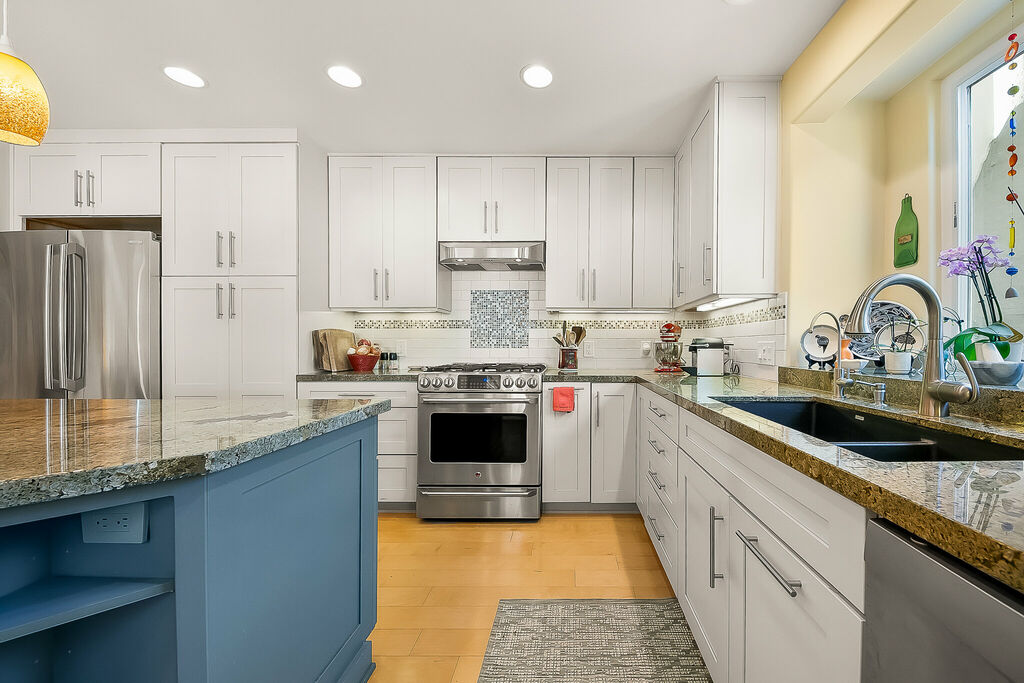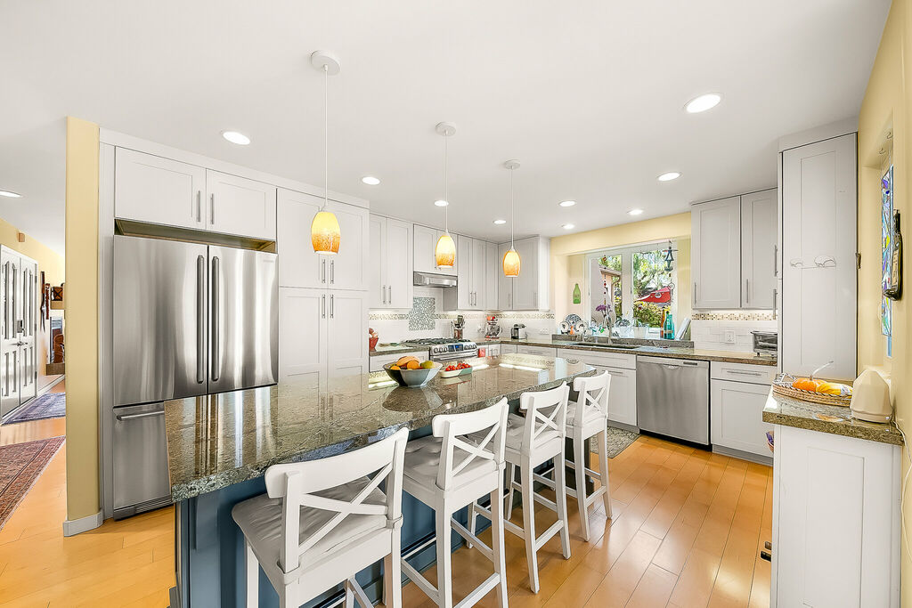 Inside, the home is bright, open, and thoughtfully laid out for gathering and comfort. The living room is filled with natural light and centered around a cozy fireplace, creating a welcoming space to unwind after a day at the beach. The updated kitchen is spacious and modern, featuring stainless steel appliances and a large island with breakfast bar seating, ideal for casual mornings, shared meals, and effortless entertaining.