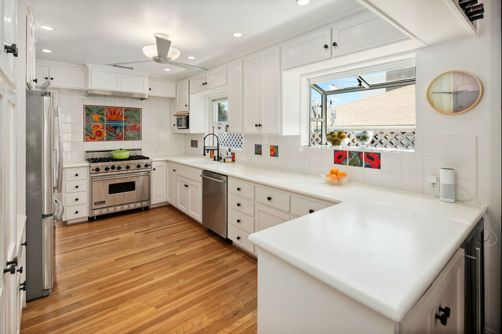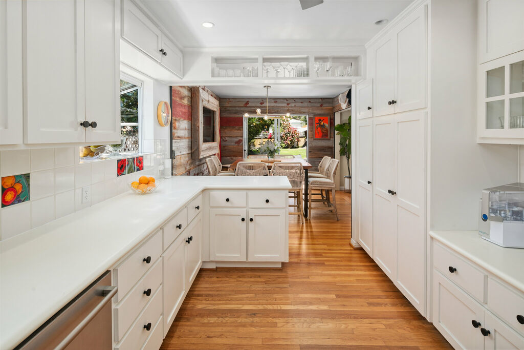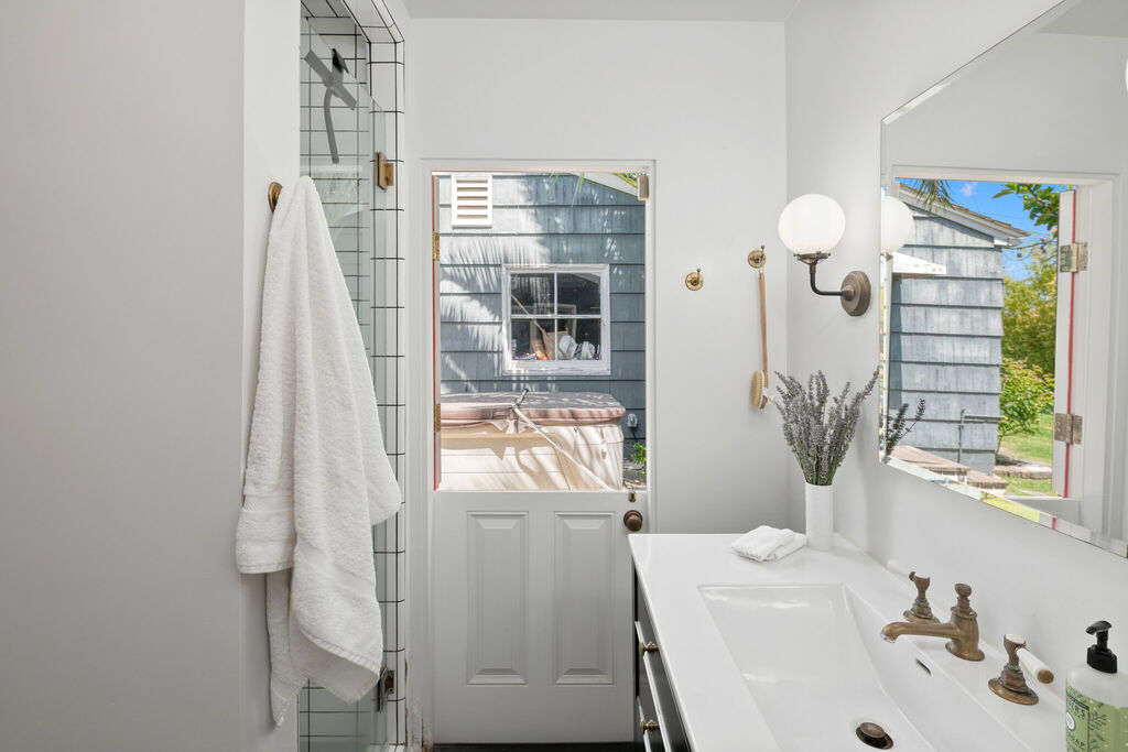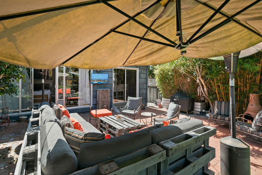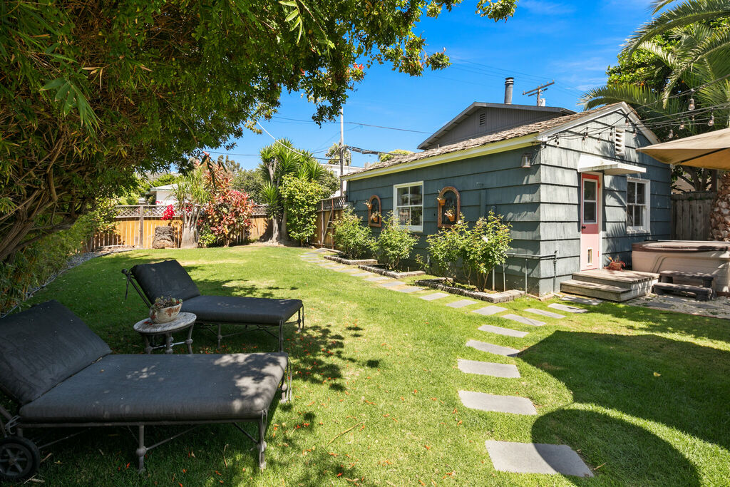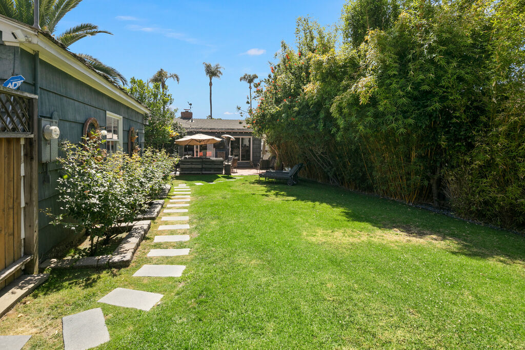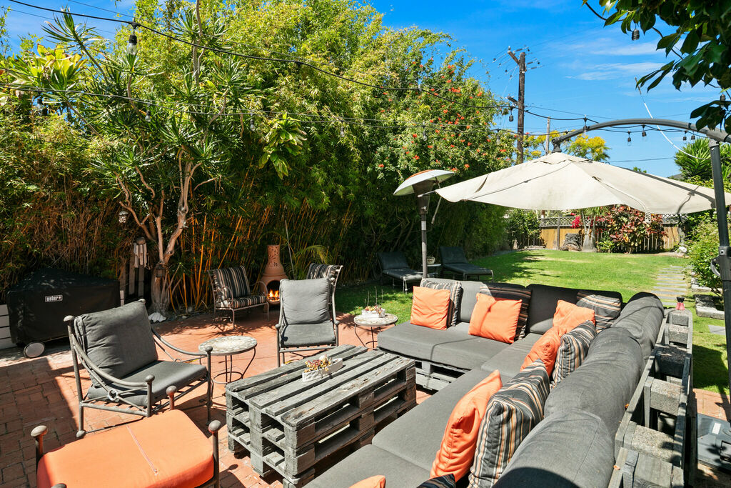 Step outside to your private backyard, featuring a comfortable seating area for morning coffee or evening wine, while the adjacent grass lawn provides a perfect space for kids to play. A pair of sun loungers offer a spot to soak up San Diego’s year-round sunshine and coastal breezes, and a relaxing jacuzzi provides the perfect way to unwind after a day at the beach.