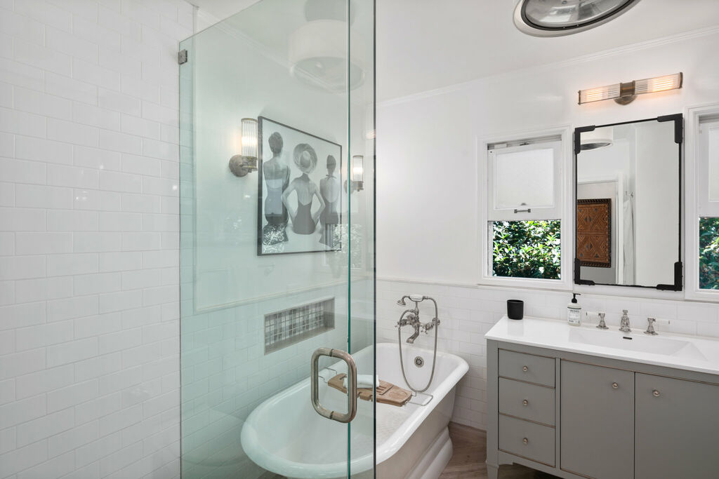 The home comfortably accommodates families or small groups with three thoughtfully appointed bedrooms. The primary suite offers a king bed and ensuite bathroom complete with a standalone soaking tub and walk-in shower. The second bedroom features a queen bed, while the third offers a full-sized bed, creating flexible sleeping arrangements for guests of all ages. A beautifully finished guest bathroom with a walk-in shower serves the additional bedrooms.