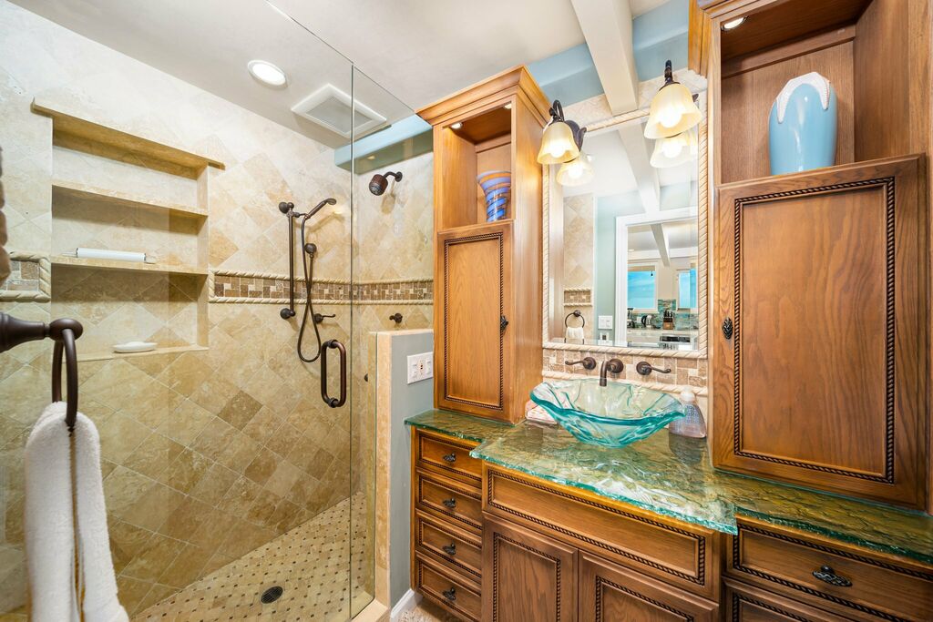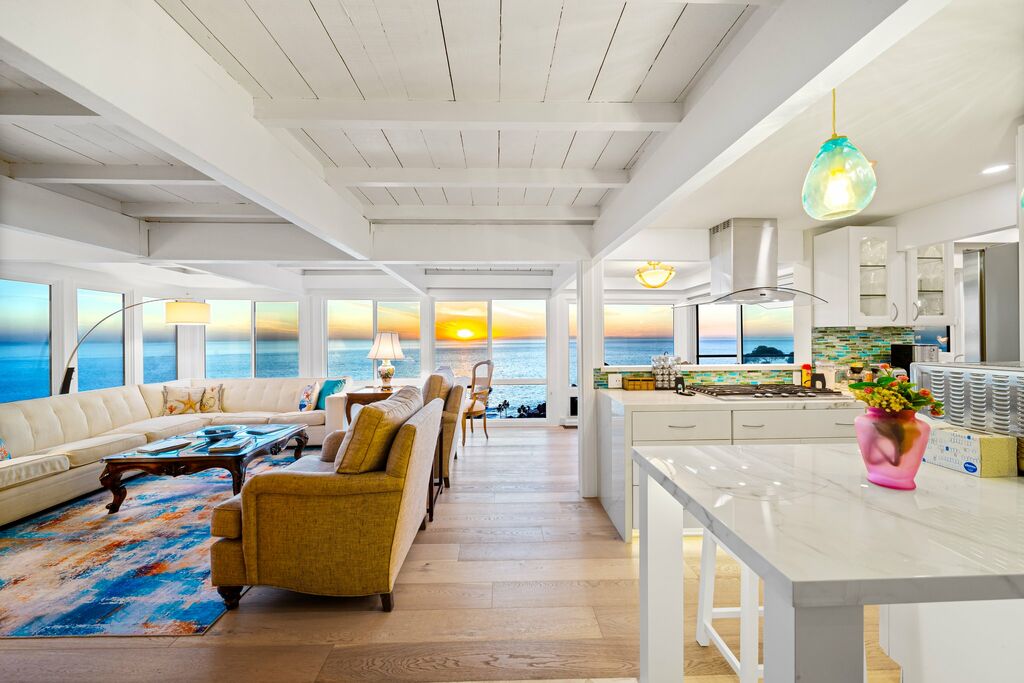 The main level is perfect for entertaining, featuring a chef’s kitchen equipped with EnergyStar KitchenAid appliances, dual contemporary seating islands, and views of the sparkling coastline. Adjacent to the kitchen are the north formal living room, with a sleeper sofa option, and the south family room, complete with a Smart TV on an electronic lift, wet bar, and wine cooler. Both spaces open to private deck with a gas barbecue, outdoor dining, and seating—ideal for sunset gatherings. This level also includes a full bathroom for guests' convenience.