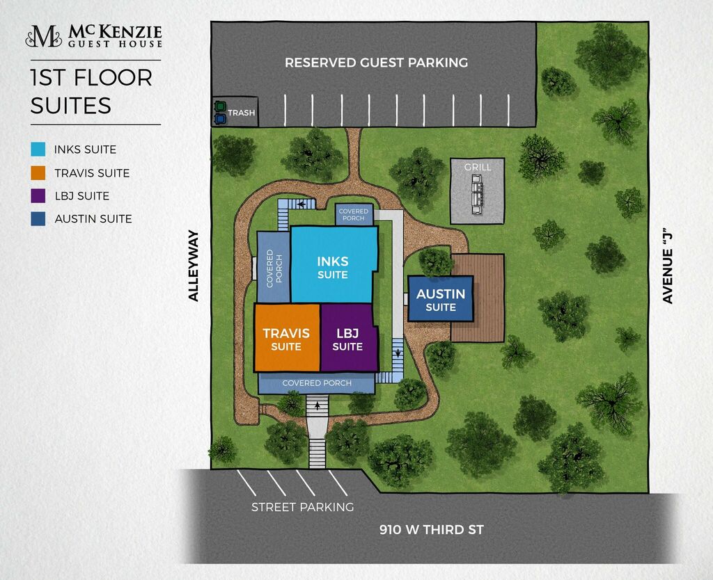Enter the LBJ Suite, one of six Refurbished Historical Landmarks at McKenzie Guest House in the heart of Marble Falls, just 1 block off Main St, walking distance to entertainment, dining, shops, art studios, and more! Originally built in 1907, this charming establishment holds a rich history of welcoming travelers from near and far. An ideal retreat for up to four esteemed guests, this suite offers a cozy living room, adorned with a queen-size sleeper sofa and a 55” Roku TV where you can enjoy moments of relaxation and shared memories.