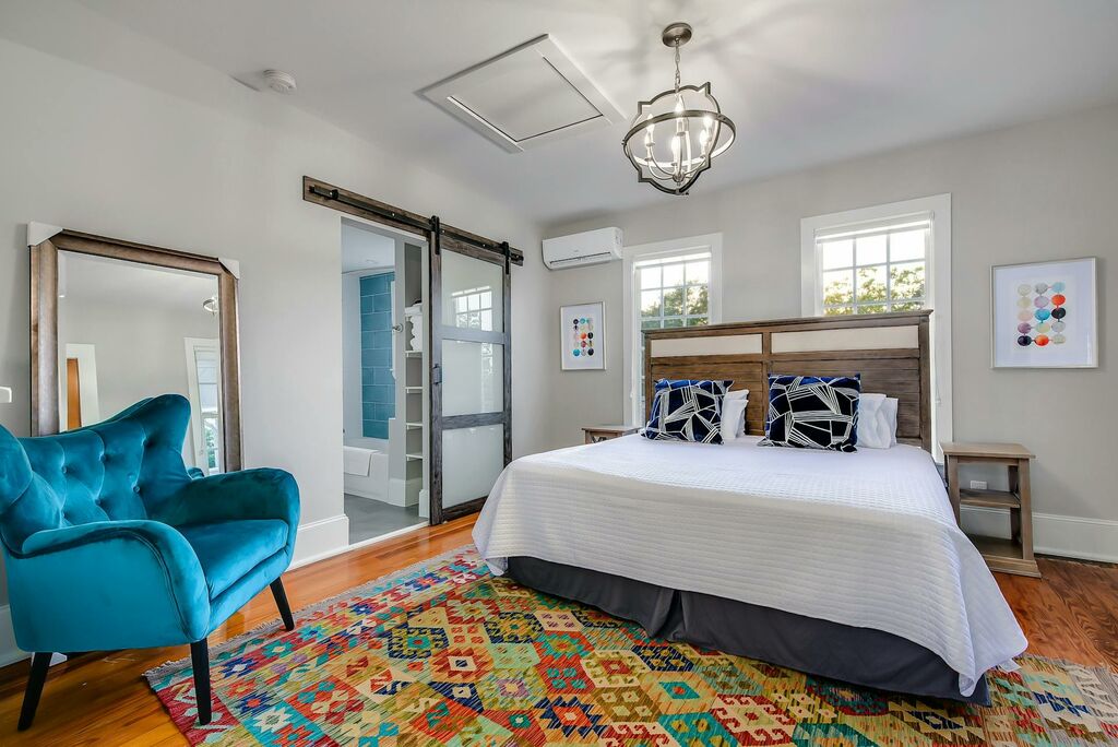 Suite Number One--Travis Suite - Enter the Travis Suite, one of six Refurbished Historical Landmarks at McKenzie Guest House. Originally built in 1907, this charming establishment holds a rich history of welcoming travelers from near and far. On the ground floor, a comfy living room with a queen sleeper sofa awaits, accompanied by a 55-inch smart TV blending seamlessly into the historic charm. Spanning across two stories, this cherished suite not only offers upgraded amenities but also exudes a distinct personality. Ascend the winding spiral staircase to find solace in the queen-size bed, with access to a spacious walk-in closet and an en-suite bathroom complete with a tub/shower combination - a perfect haven for relaxation after a day of exploration. Outdoor lovers can step out onto the covered terraces on both levels.