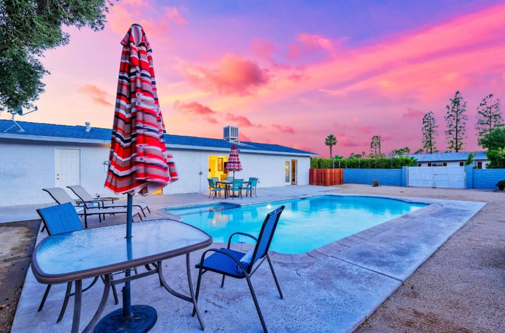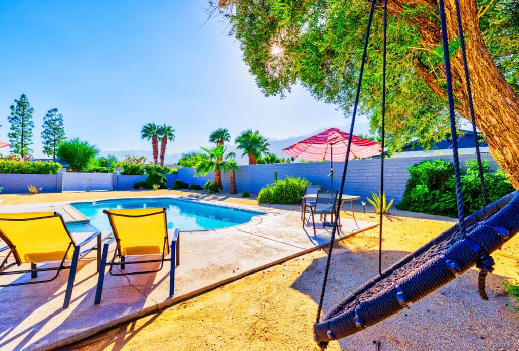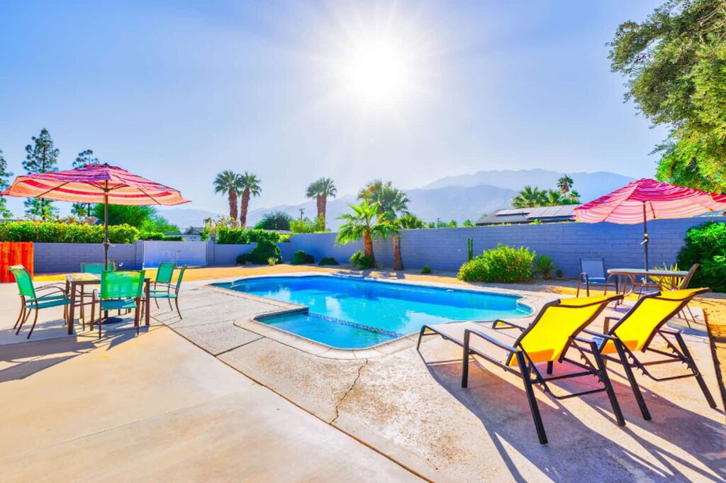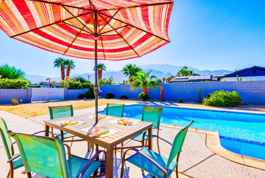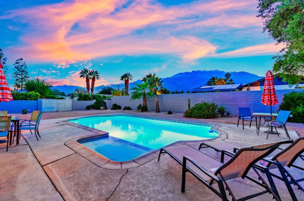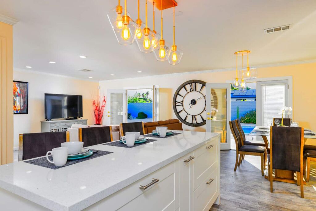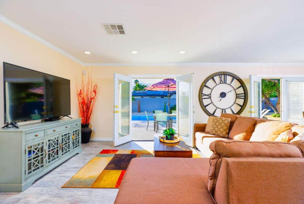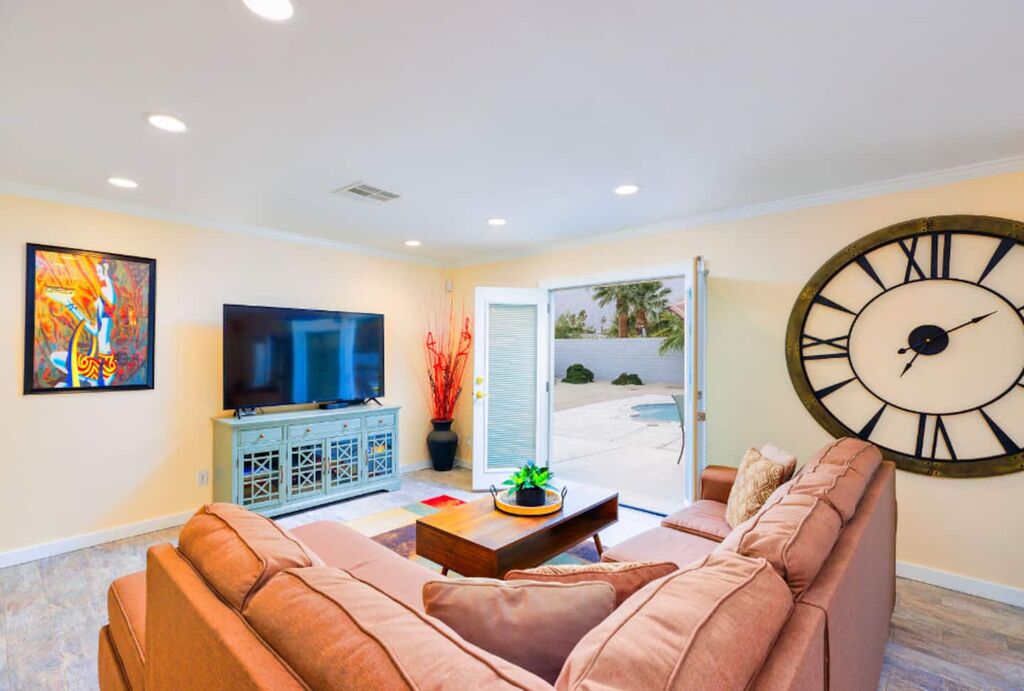 This contemporary home boasts brand new appliances, wood-tone tile flooring, modern furnishings, and vibrant decor throughout. It perfectly embodies the Palm Springs lifestyle, known for its seamless indoor-outdoor living. Step onto the patio and soak up the abundant sunshine while sipping cocktails with friends or take a refreshing dip in the sparkling pool (heating available for an additional fee) while enjoying the backdrop of majestic mountains. In the evening, gather with loved ones and unwind while stargazing from the in-ground spa. The open floor plan makes dining and entertaining a breeze, and the well-equipped kitchen is ready for your culinary creations, with seating available in the stylish dining area or at the kitchen island. The brightly decorated living area features a comfy sectional sofa, a splendid 50” HDTV, and a captivating view of the outdoor pool and the distant mountains.